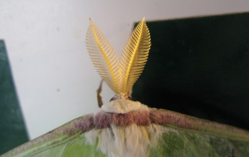 Note the loops of the feathery antennae, above, and the white underline in the eyespots, below (click on image to open to bigger view).