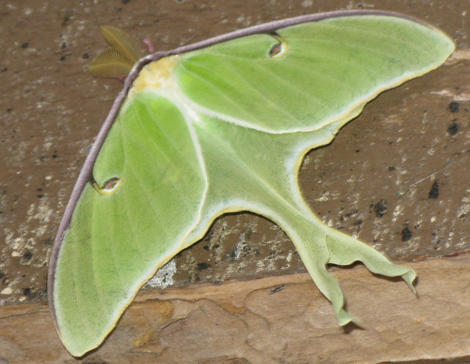 Later in the day, when we took shelter from a downpour, we found another luna hanging onto the wall of a campground restroom. Like the first, it had been attracted to the structure’s light.
