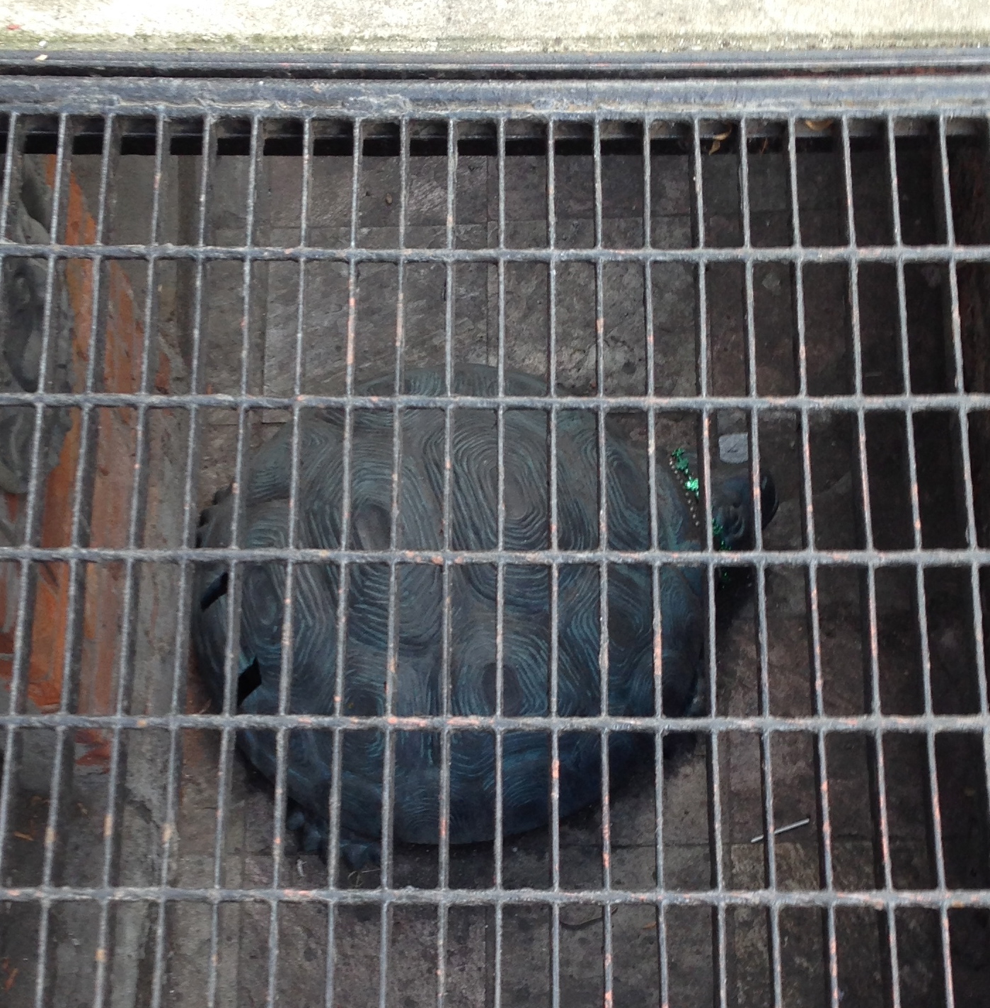 Well, you know how I like keep my eyes peeled like a grape for evidence of the world rushing in, so when I was in SoHo recently — an aberration on my part, but the tarts are delicious — I happened to catch one of these secretive animals passing below the sidewalk grating. Zounds! The shell is a full yard long! The creature was of course lumbering in that deliberate time-is-different-for-us way. Judging from the shiny baubles around its bullish neck, I’d say it was either returning from a bender, if not N’Orleans, or an anointing by a cult of Kurma-worshippers. March on, noble Testudinidae!