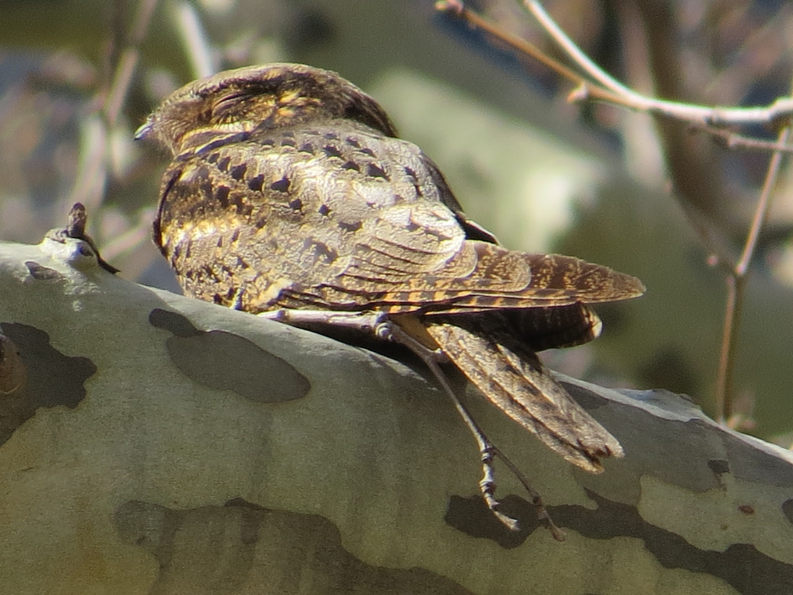 The bird’s eyes are closed in the strong sunlight. They spend the day perched on branches and hunt airborne insects at night. That tiny-looking beak is actually just the front edge of a huge mouth, all the better for gobbling through the sky like a vacuum-cleaner. (Update: turns out they’ll even take birds! Here’s a report from the Wilson Bulletin and here’s a blurry pic of a Waterthrush in the maw.)