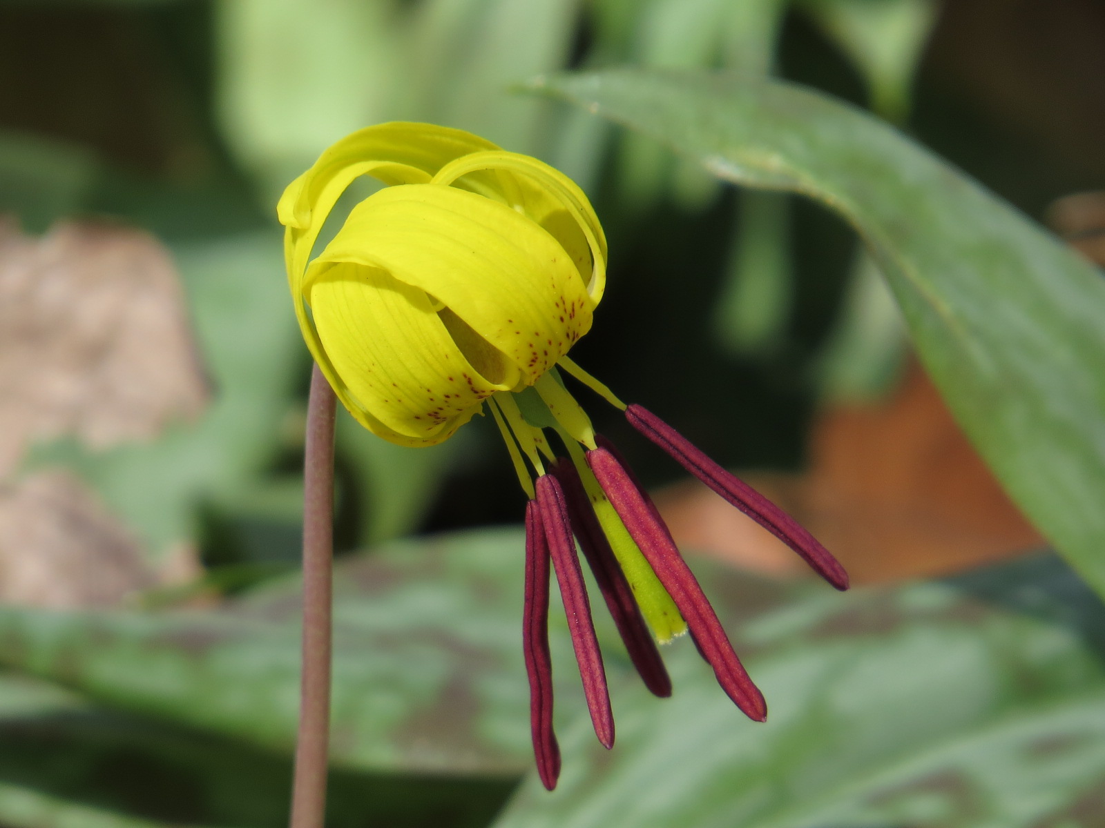 The common name seems to come from the mottled pattern of the leaves, like a trout’s scale pattern. Flowering versions have a pair of leaves; non-flowering versions have a single leaf and are usually members of a clonal colony, duplicates of their neighbors. According to Carol Gracie, other names for this flower include Adder’s Tongue, Fawn-lily, and Dog-tooth Violet.