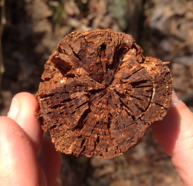 The devastation caused by the aphid-like Hemlock Wooly Adelgid (Adelges tsugae) was on display on our visit to Black Rock Forest. It was grim: skeletal bones of dead trees towered above us, waiting to fall. The Adelgids, which are fairly benign in their native Japan, where their host trees evolved along with them, kill our Eastern Hemlocks (Tsuga canadensis) after just a few years of infestation. There wasn’t a healthy mature Hemlock to be seen; some still had a bit of green at the top, but most were dead.And rotting: this was the heart of one of the fallen old giants. At least there’s the cycling of nutrients back into the ecosystem from this ruin.