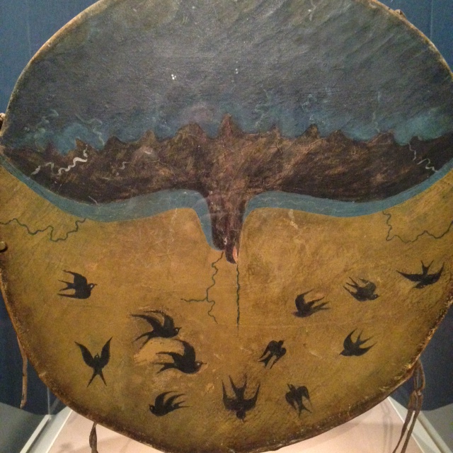 Shield with guardian sporty. Arikara artist, North Dakota, ca. 1850. Buffalo rawhide, native-tanned leather, pigment.