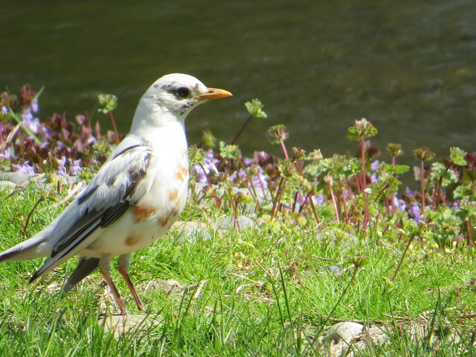 There was a leucistic American Robin (Turdus migratorius) seen in Prospect Park for at least five years, if I remember correctly. This one, spotted in Green-Wood last week, has much less pigmentation in the feathers.