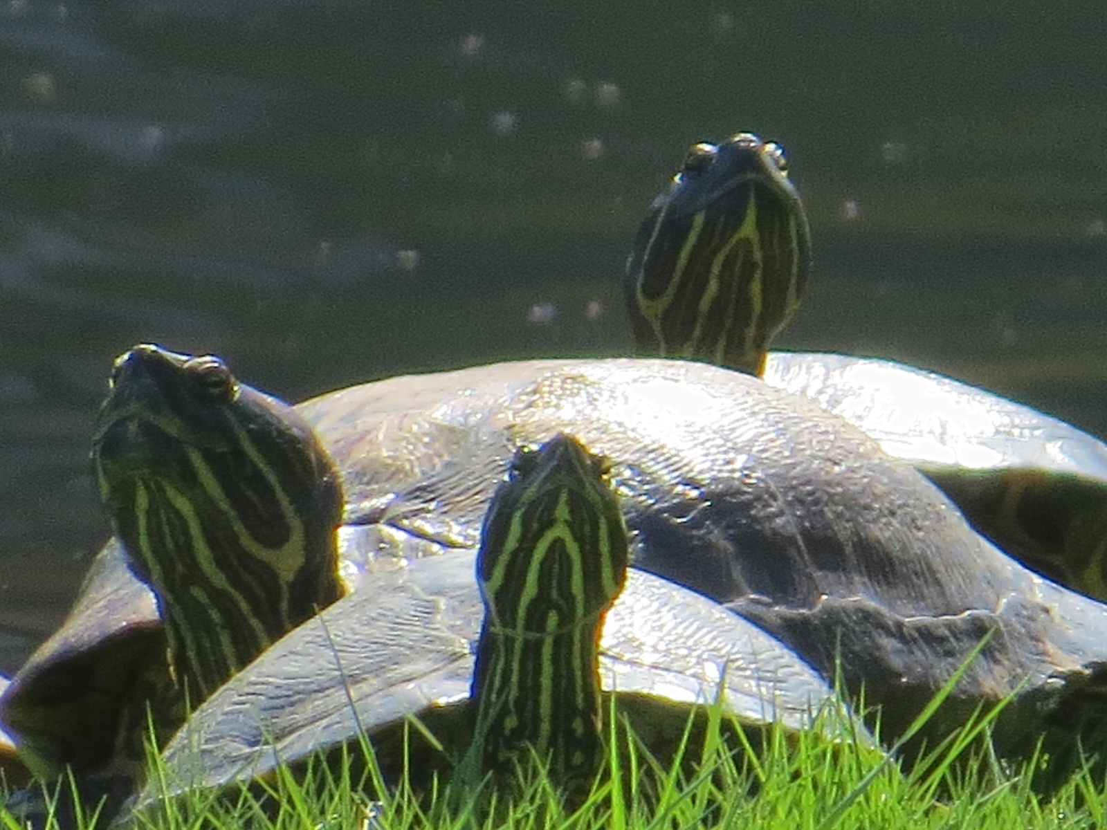 The all too-common Red-eared Slider (Trachemys scripta). Note those neck line patterns.
