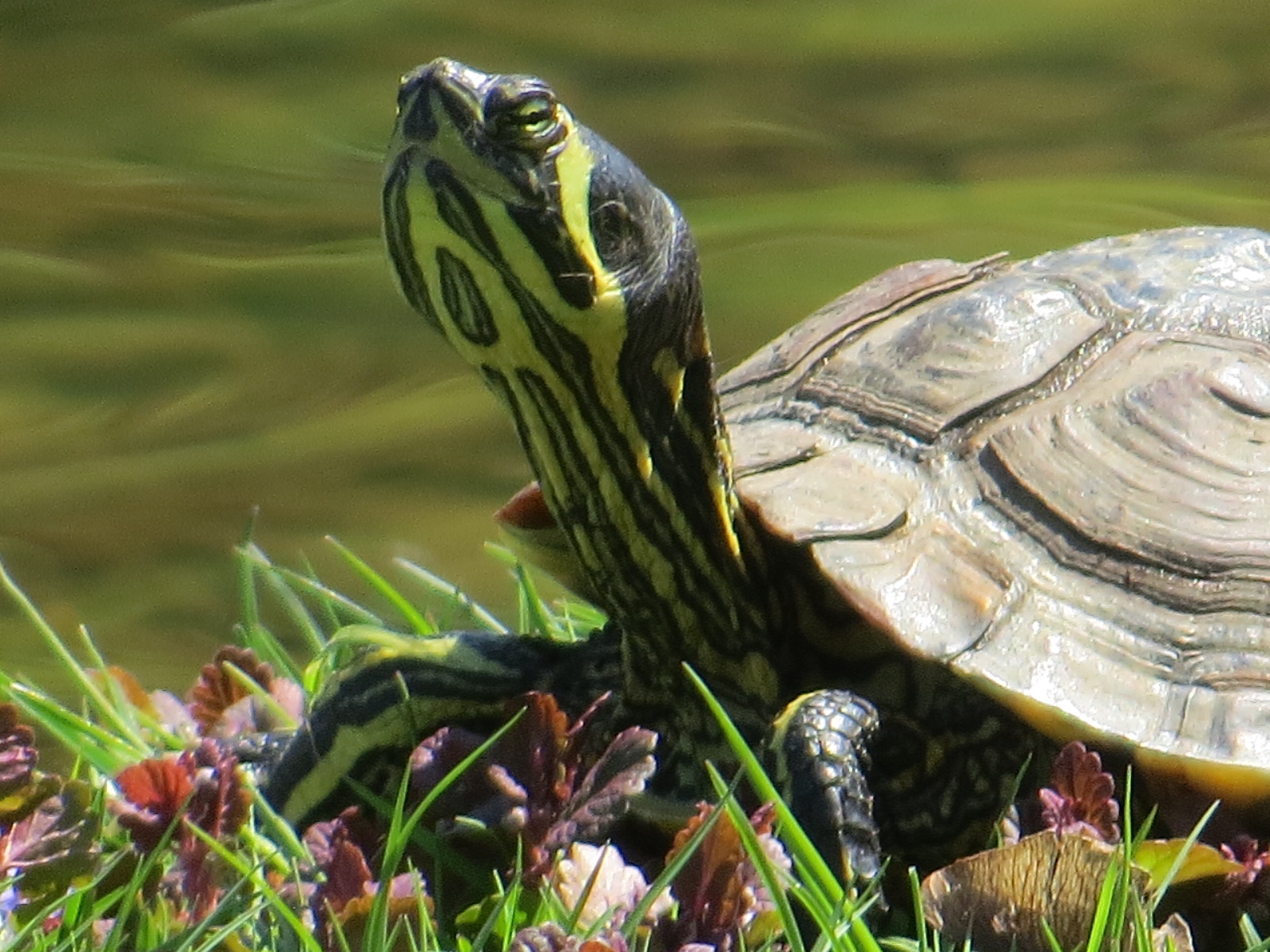 And by having an oval shape on the neck. Missing, too, is the red stripe behind the eyes which give Red-eareds their name. The stripe can fade with age, but this one is not so large/old. Still, I can’t figure out what species this could be if not a RES.