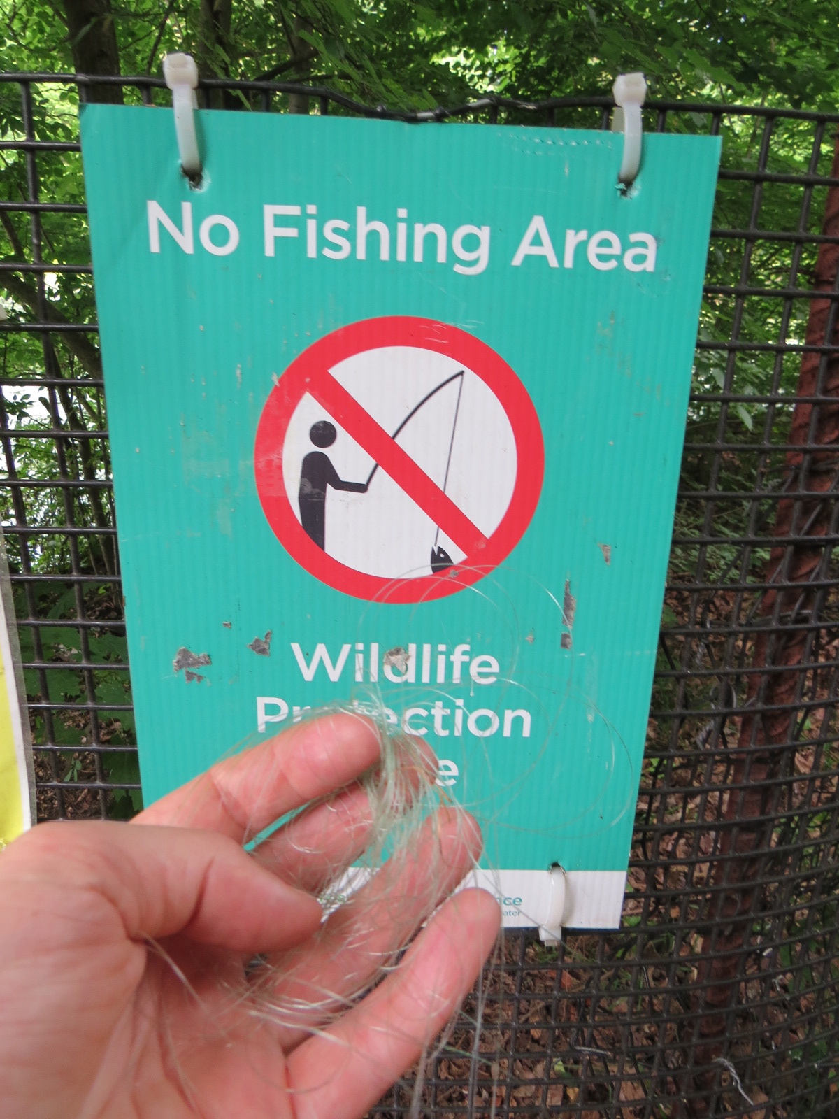 Fishing garbage found in the Lullwater. No hooks on this mess, luckily, but we’ve all seen the damage this shit does to birds and mammals right here in Prospect Park. We gathered it up and canned it, since the fish-torturer was too much of an asshole to do so.