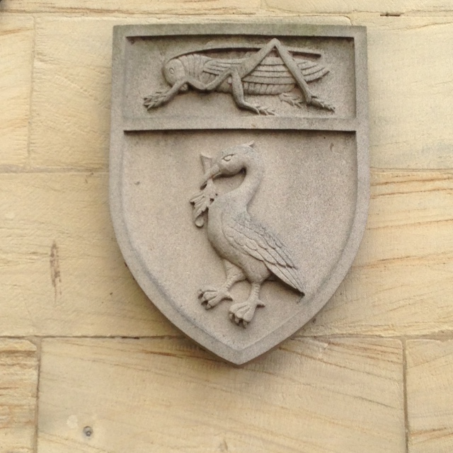 Saw this in two different spots and wondered. Turns out to be the symbol of the old Martins Bank, defunct since 1969. 16th century beginnings with London goldsmiths, who banked under the sign of the Grasshopper.The bird is Liverpool’s “Liver Bird,” a cormorant which has been the city’s symbol since at least the 14th C. It joined the Grasshopper after a merger with Bank of Liverpool in 1928.