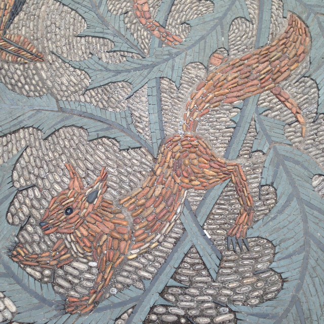 A Red Squirrel in a mosaic at the National Portrait Gallery. The animal itself, Sciurus vulgaris, is in critical condition in the UK due to the invasive Gray (yes, our familiar North American park inhabitant) and habitat loss. The Grey is not only larger and more aggressive but carries a pox which it is immune to but which horribly disfigures and kills the Red. We saw a Grey in Edinburgh’s Botanic Garden, but no Reds anywhere. The Berwick Red Squirrel Group’s hazelnut-filled boxes were noted in Shiellow Wood south of Fenwick.