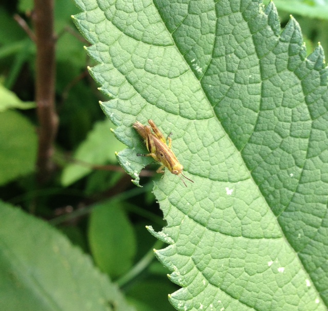 A young (early instar) grasshopper, and a much more ragged edge of leaf-munching. The short antennae are a quick distinguishing mark from their Orthoptera cousins, the katydids.