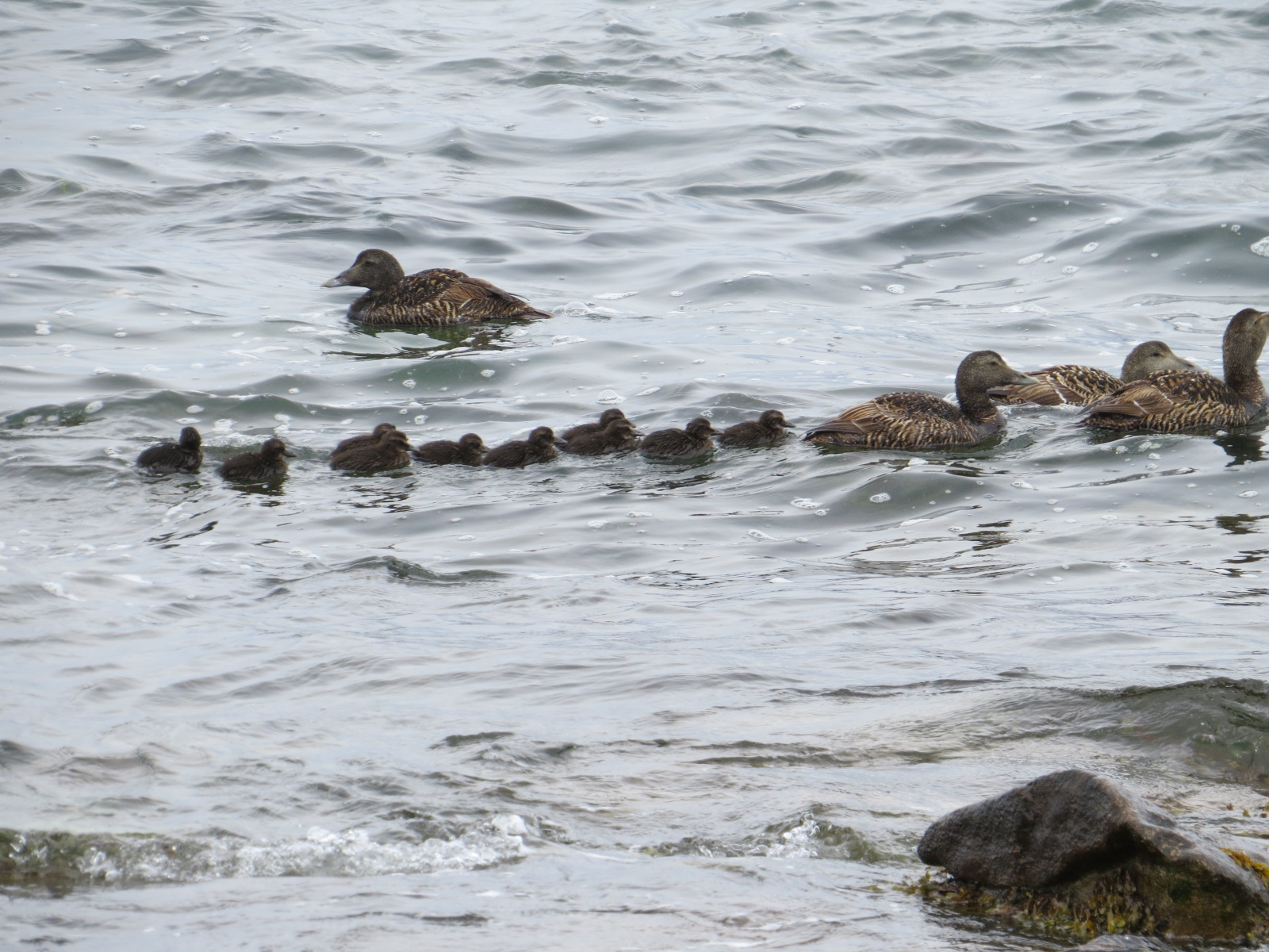 Several female Common Eider (Somateria mollissima) shepherding a whole flotilla of their (?) young.