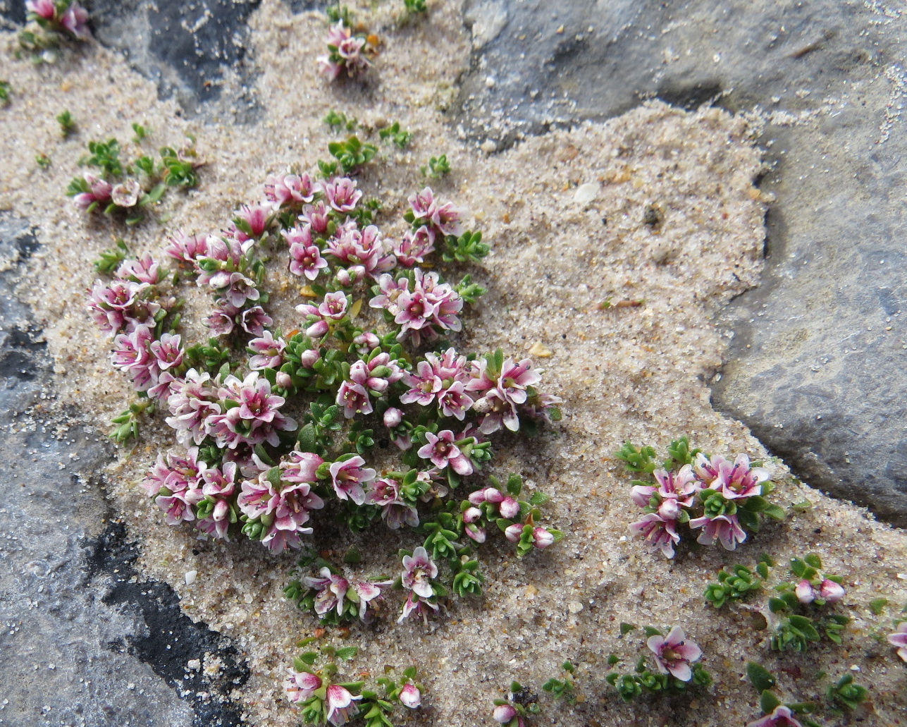 Speaking of salt tolerance: near the tad-pools were some clumps of Glaux maritima, which seems to have more common names than you can shake a tadpole at, including, in the UK, Sea Milkwort. Found across the northern hemisphere, on coasts and high-elevation alkaline meadows.