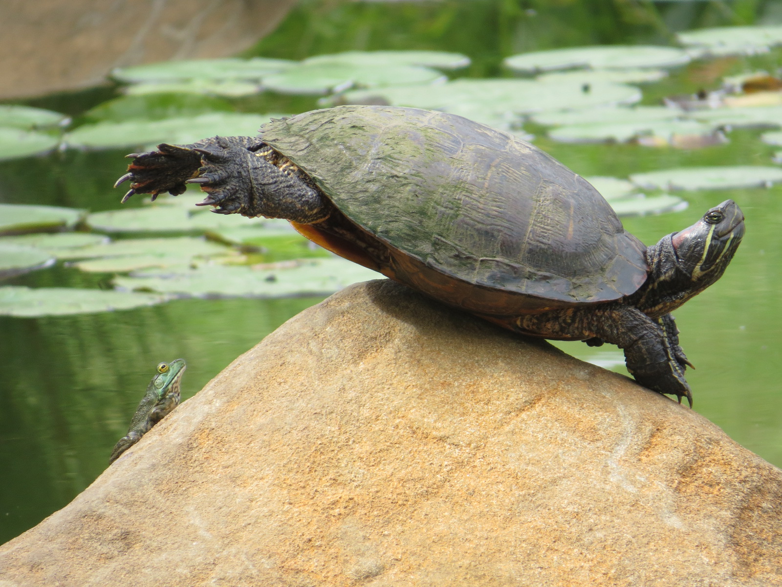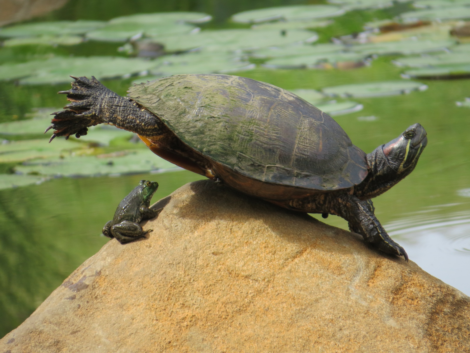 Definitely a parable in the making ,what an odd way for a turtle to position himself . I’m routing for the frog .
