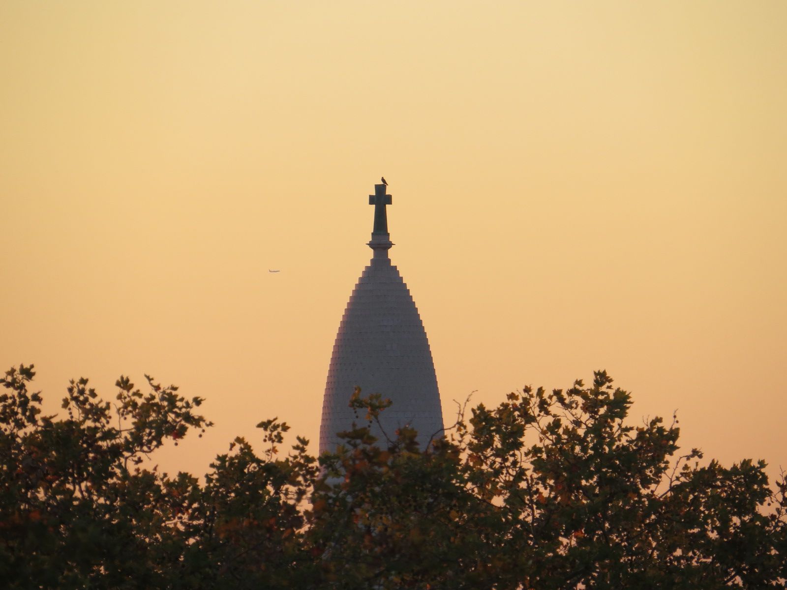 Since moving to Sunset Park in late August, I’ve kept an eye out for birds on the top of the local landmark, St. Michael’s RC Church on 4th Avenue at 42nd. The cross on the steeple seems like a perfect perch for raptors, making them the lord of all they survey. For until this century, it was, supposedly, the second highest building in Brooklyn after the Williamsburgh Savings Bank. But until last evening, I hadn’t seen a single bird up there. Seemed like a waste of good architecture.