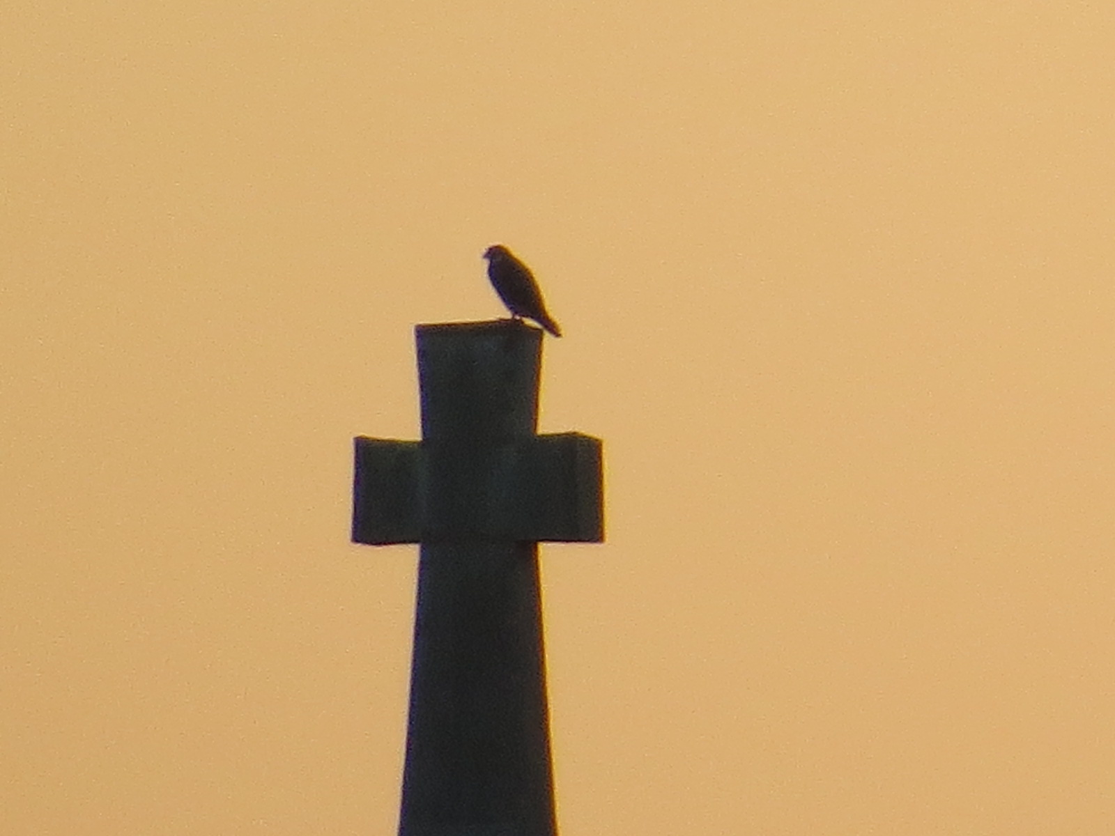 Last night I noticed something not quite right with cross’s silhouette near sunset. Sure enough, the field glasses revealed a bird. The church is two long blocks away, so I had to use all my super birding-powers to get a bead on it. Seeing it in the air confirmed it.