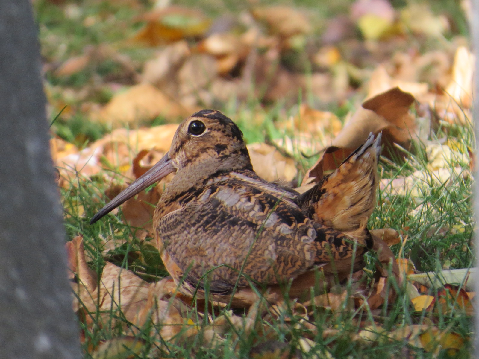 In the fall, it’s not unheard of to flush an American Woodcock while walking in Green-Wood. They explode out of the leaf litter — the first time it happened to me, I was unknowingly close to the bird, so I was perhaps more startled than it was. Their plumage corresponds wonderfully to leaf litter. They will usually vocalize with a distinct twitter as they fly, which means you may hear them more than see them. And of course, they fly away from you. I heard one yesterday but saw no sign of it. Last week I saw and heard three at a distance; it might very well have been the same bird. This afternoon, someone else flushed this bird, and so it flew closer to us and was visible between two tombstones for a moment or two before it flew off again.