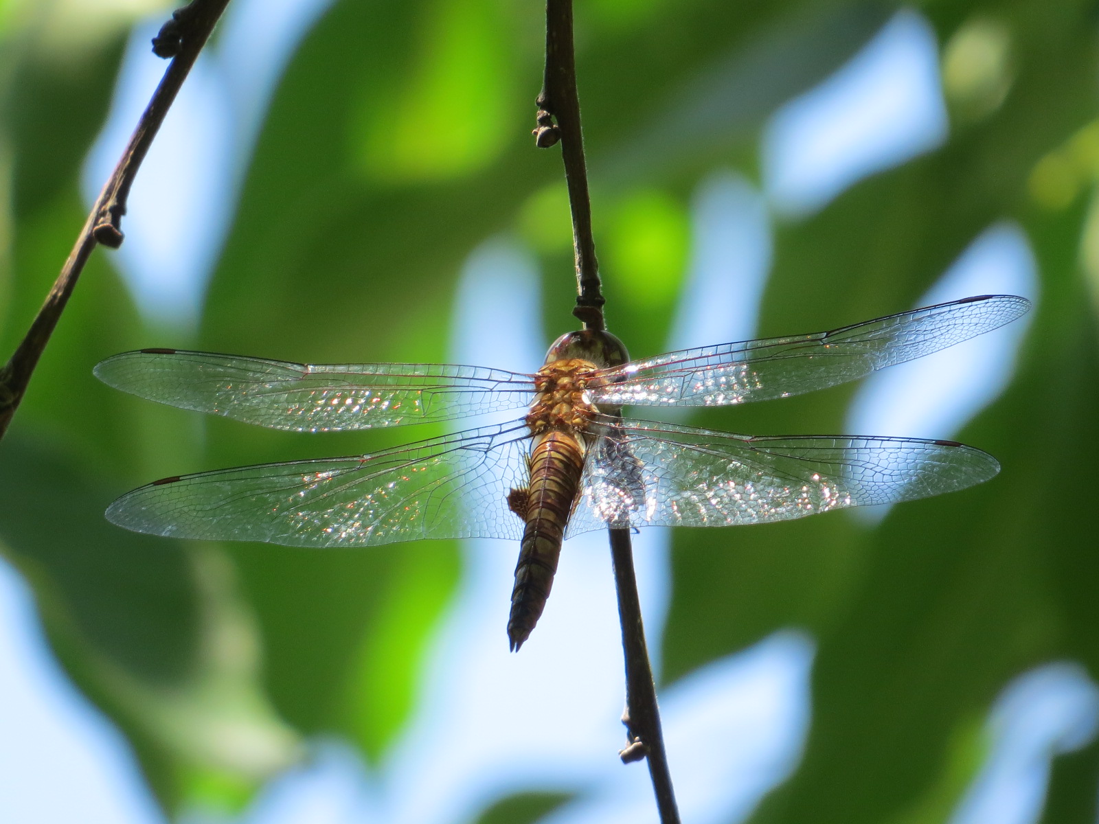 You may wait a long time before one of these gliders comes to a stop. Both the Spot-winged (Pantala hymenaea) and Wandering Glider (Pantala flavescens) dragonflies seem to spend their whole working day in the air. These are the constantly moving yellow to golden dragonflies that are now being seen above our meadows and grassy swards. Their zig-zaggy dance is hypnotic.