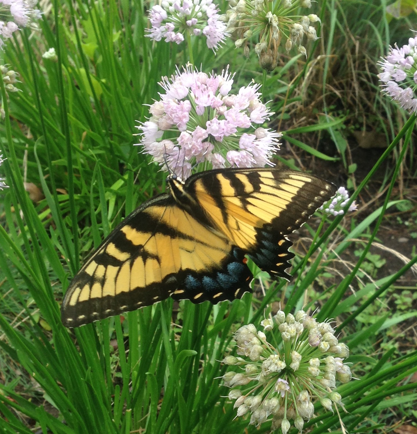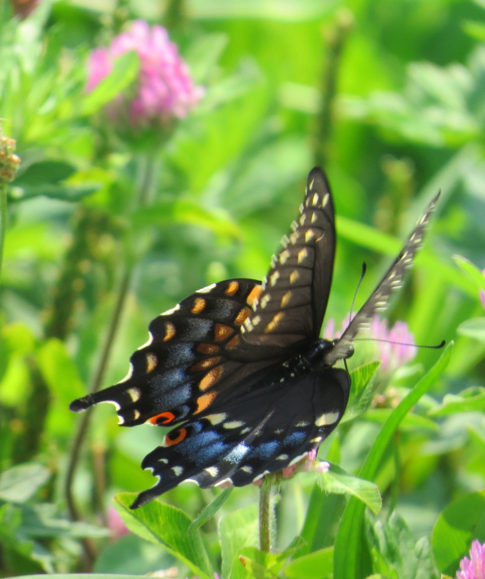Eastern Tiger Swallowtail(Papilio glaucus) female. A very conspicuous butterfly, both for her size (4-4.5″ wingspan) and her bold tiger-like patterning. Males lack the deep blue.