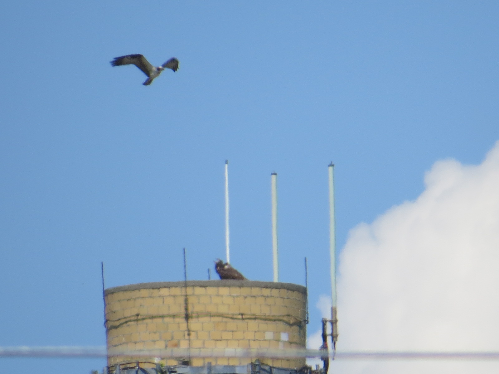 An Osprey mixed it up with them. Here it’s buzzing one of the young eagles. Primarily fish-eaters and scavengers, Bald Eagles are not averse to taking young Osprey right out of the nest.
