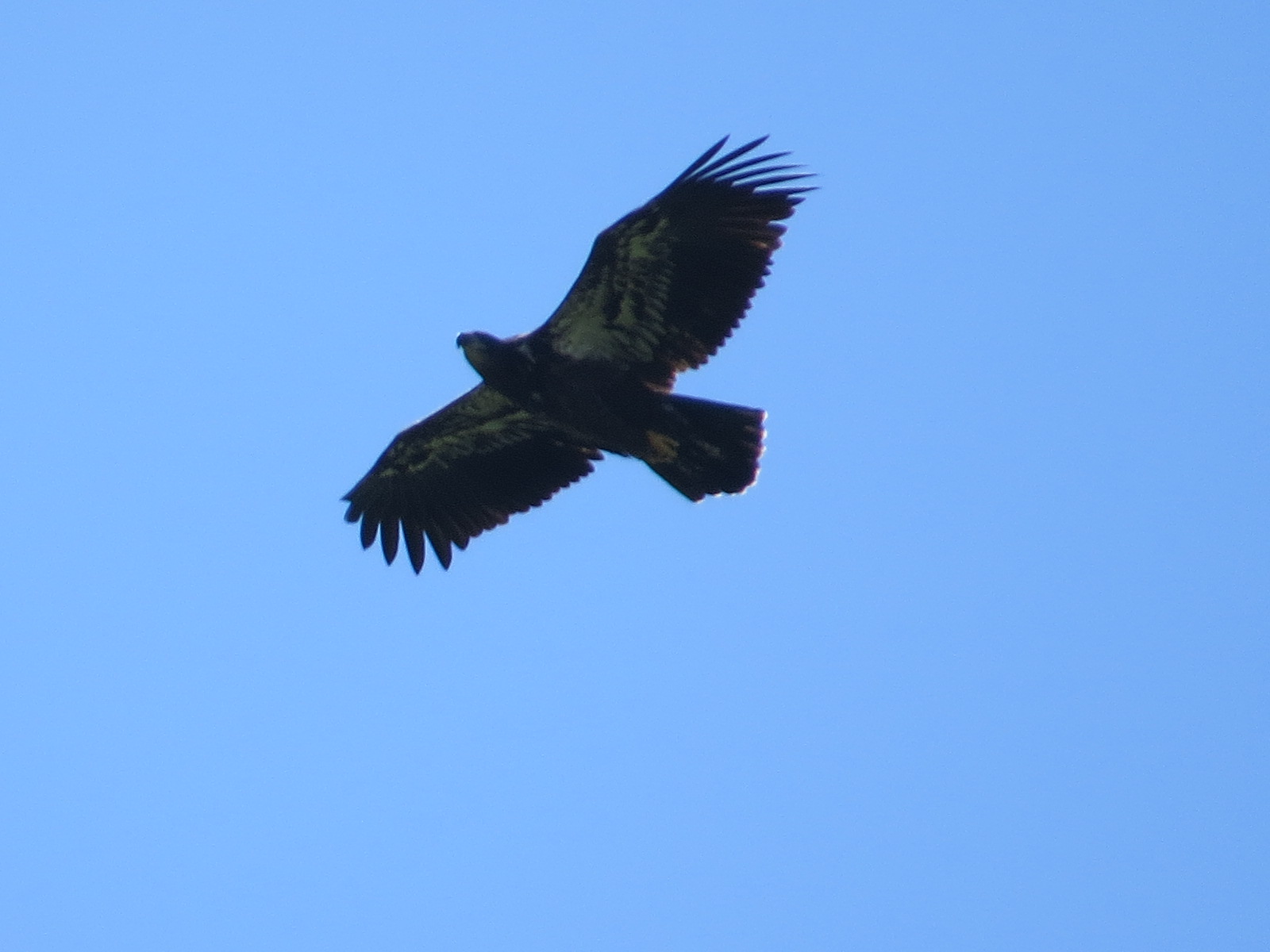 But as soon as we got out of the car the other day, we noticed two big dark birds in the distance behind the church on the other side of Hylan Blvd. Vultures, right? (This made me think that I have not seen a lot of vultures this summer.) But but but… no. Not vultures: too brown, flapping too much, not holding their wings in that vulturine dihedral… wait a sec! Yes, eagles. A mature third bird, with white head and tail, definitely put the frosting on that cake. All three were briefly perched on the old brick chimney near the church.