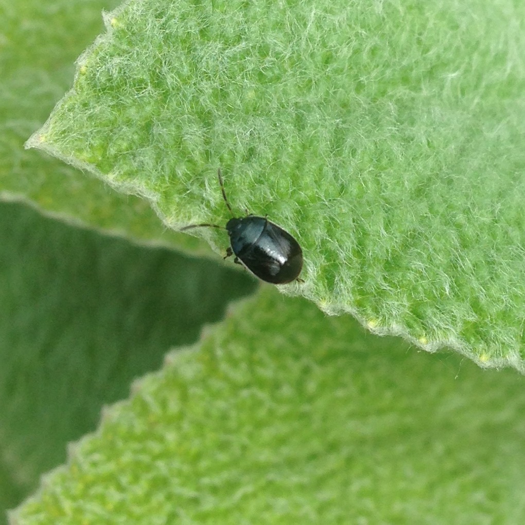 This tiny beetle is Sehirus cinctus, the White-margined Burrowing Beetle. 4-6.5mm long. There were several on the very hairy leaves of what looks like Stachys something or other.