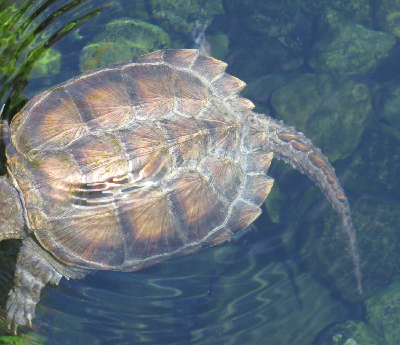 Note the spotless shell. Compare with another snap seen two years ago in the Discovery Center pond. Much more growth on the shell of that younger specimen. The huge beastie I’ve seen in Prospect Park’s watercourse a few times over the years has also evinced a spotless shell, which I attribute to chorine in the water (yes, it’s tap water). Here’s a little one in the Prospect Pools. Here’s a tiny one I found crossing the road a few years ago in Massachusetts.