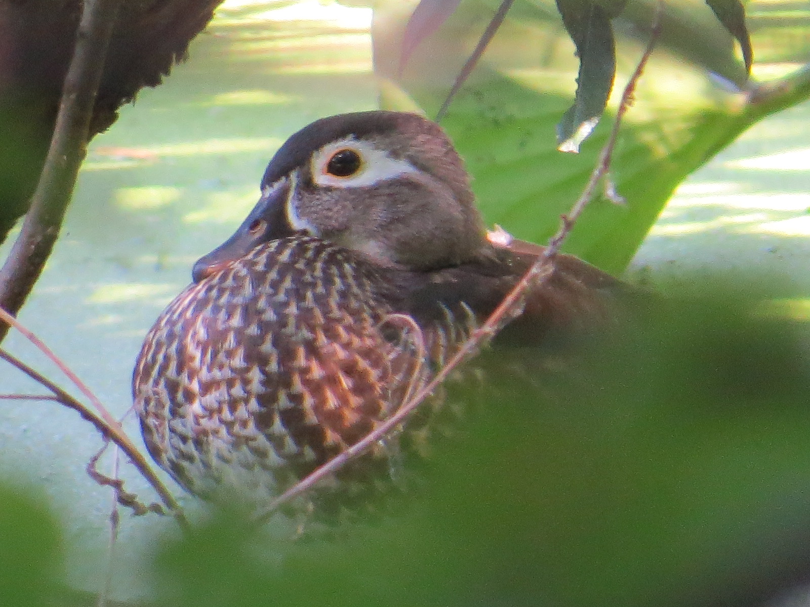 A female Wood Duck (Aix sponsa) through several layers of wild. There were at least seven on the Pools recently.