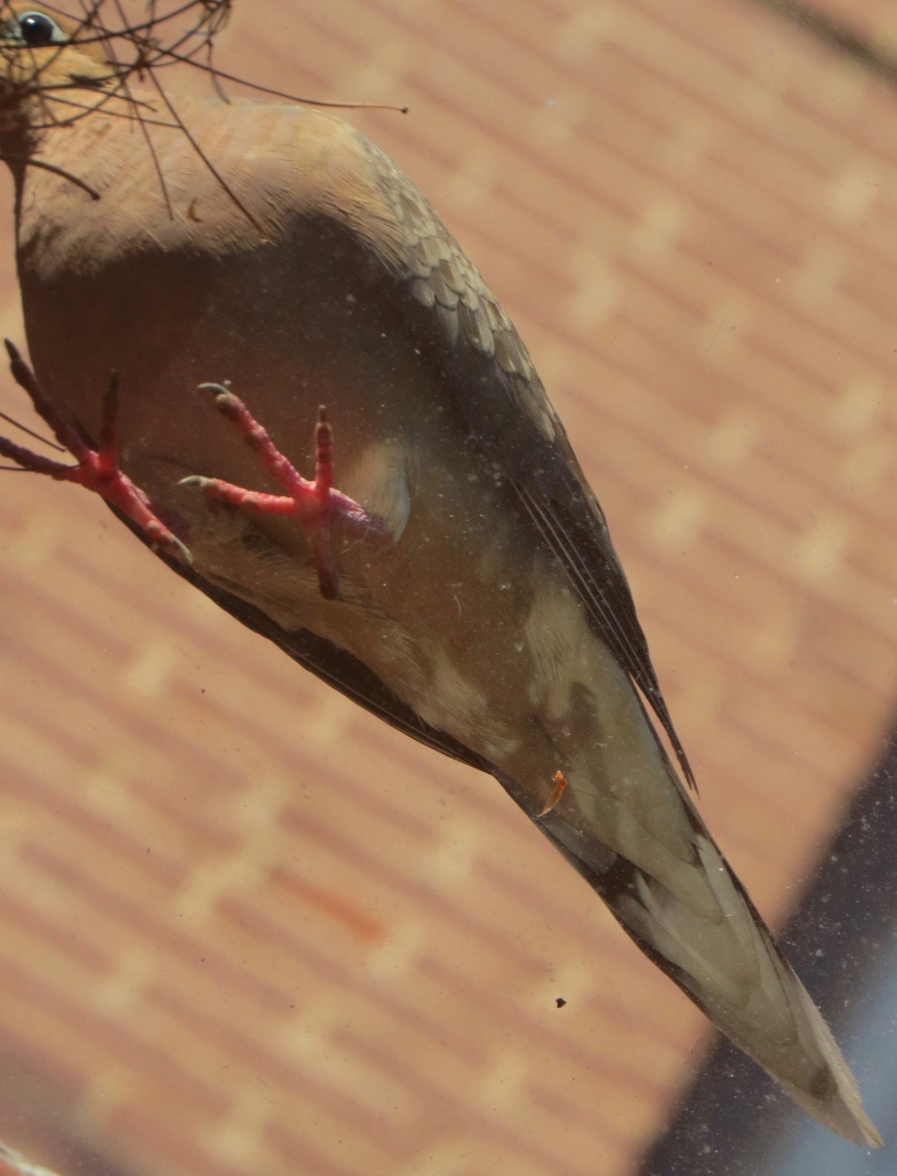 On a glass roof. A not bad illustration of the anisodactyl pattern, the three toes forward/one back arrangement of some bird feet. Passerines, the song birds, also known as perching birds, have this layout. The members of order Passeriformes make up half of all bird species. Doves, however, even with the same toe-pattern, are members of the order Columbiformes.