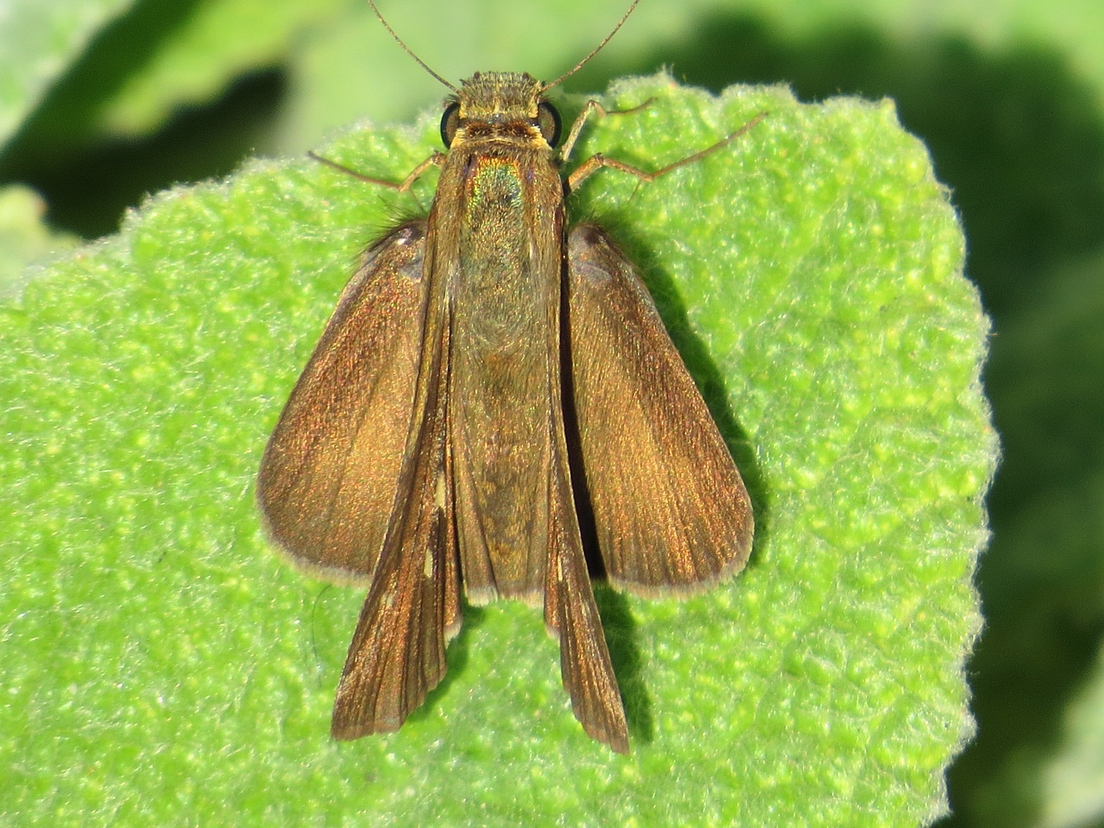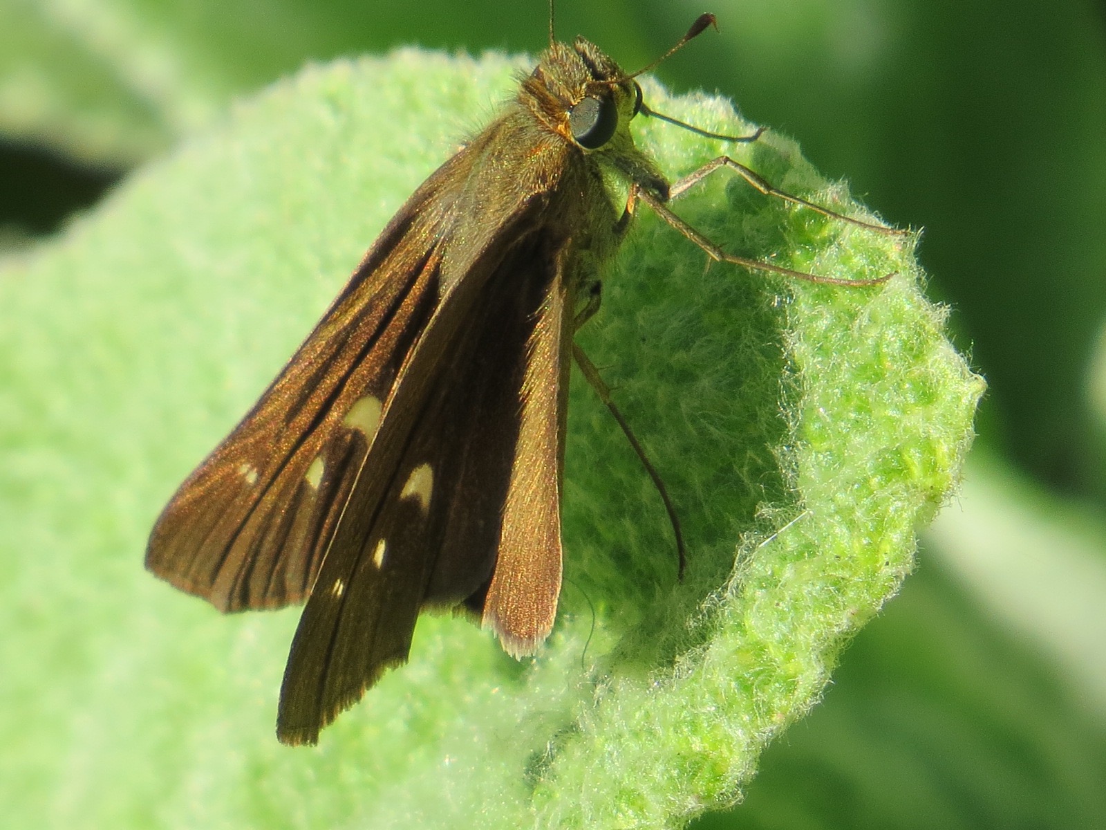 Note the long forewings here, which certainly makes it stick out of the common storm of skippers. This is an Ocola Skipper (Panoquina ocola), a butterfly of the southeast (and down to Paraguay) that occasionally gets as far north as Canada. It’s a “regular stray” up here according to the Kaufman guide.