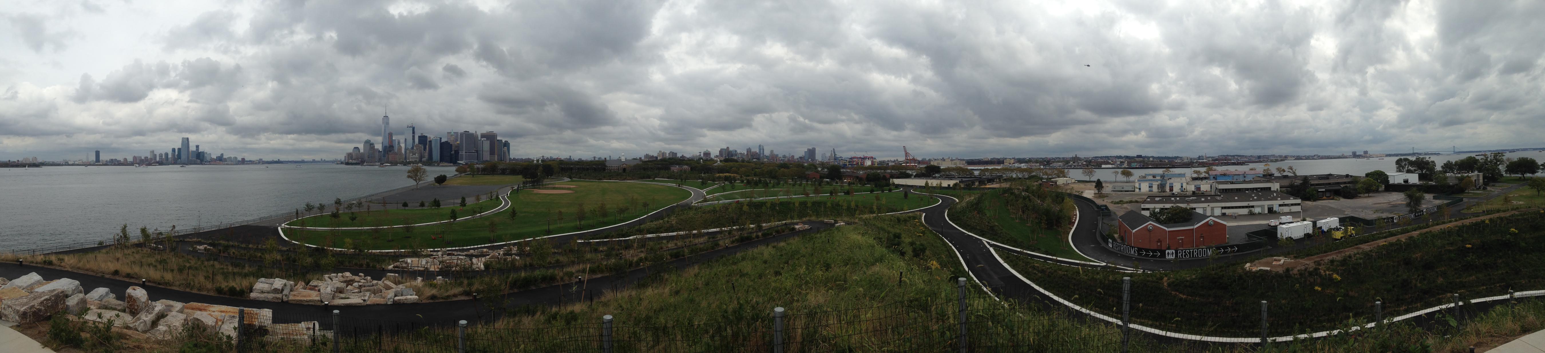 A panorama from the height. In the distance from the left: Jersey City, Manhattan, Brooklyn. (Click for a larger version.)