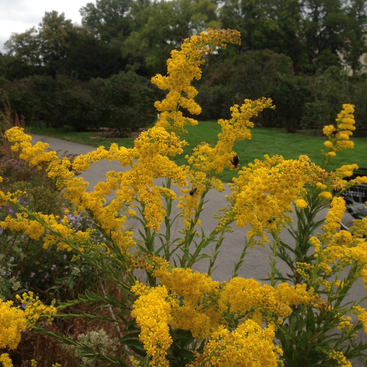 This goldenrod was chock-a-stem with bumblebees, carpenter bees, and honeybees, moving slowly if at all on a cool day. You could pet them if you liked.