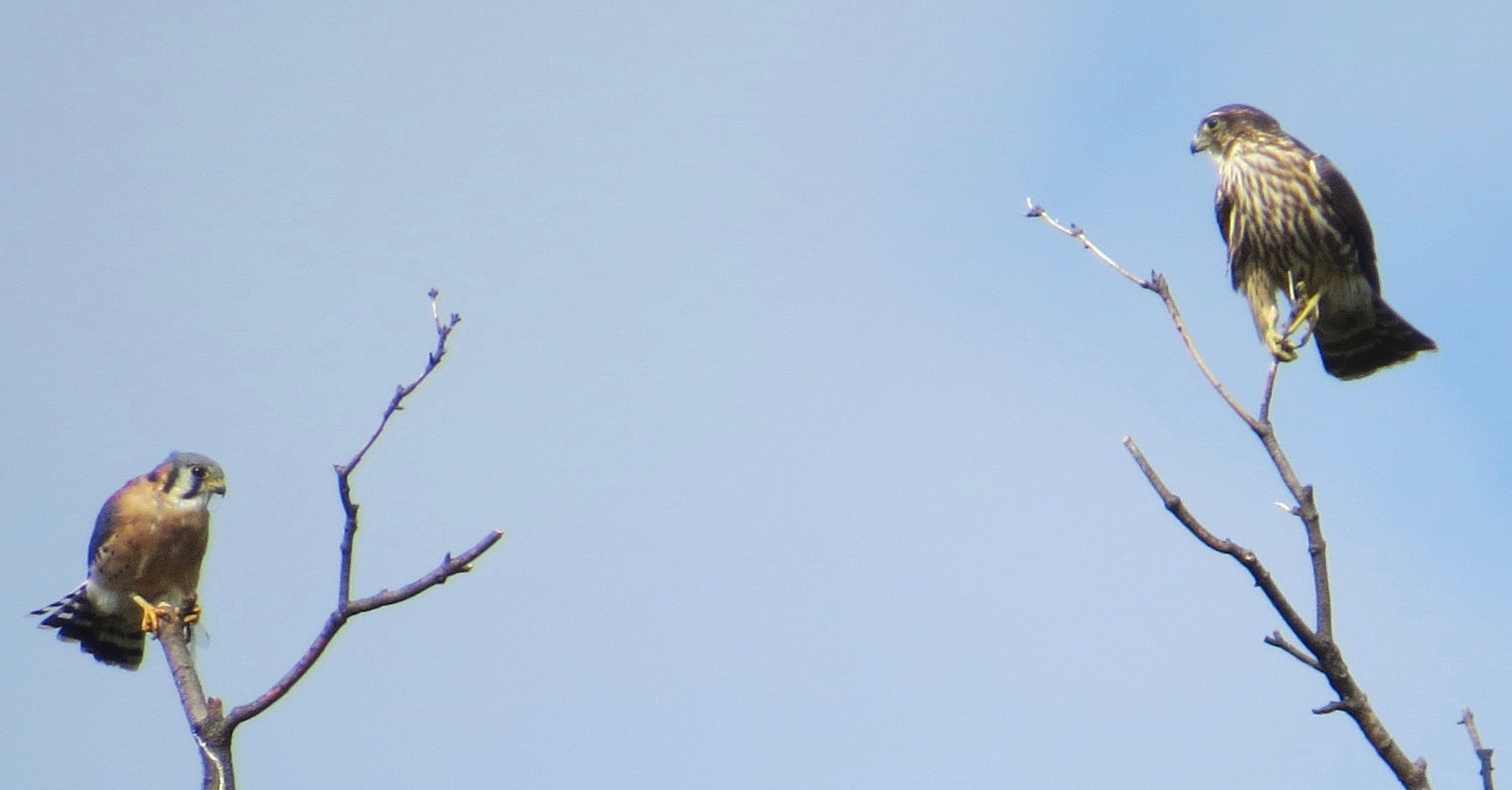 The Kestrel was munching on a dragonfly, probably a Common Green Darner. And then the Merlin showed up.