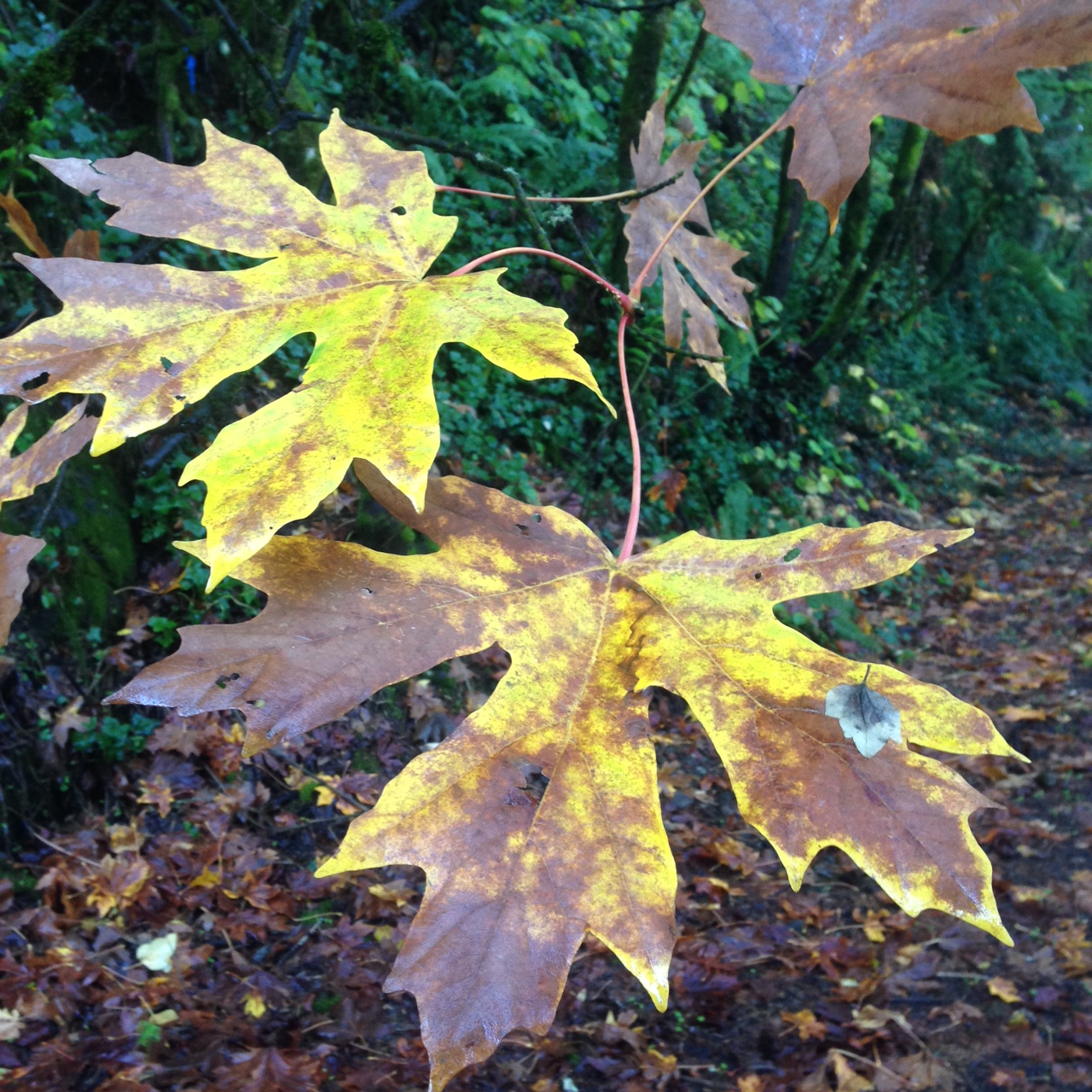 Acer macrophyllum is one big-leafed maple. Also known as Oregon Maple, these trees of the moist, shady canyons of the Coast Range can have leaves 9″ or more long. The leafstalk can be up to a foot long.