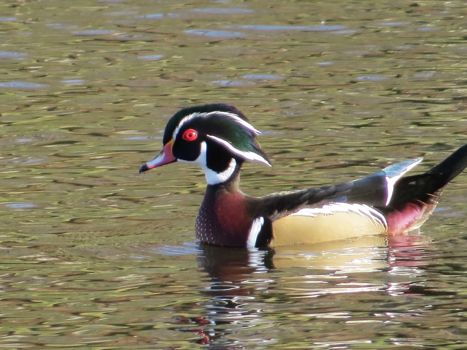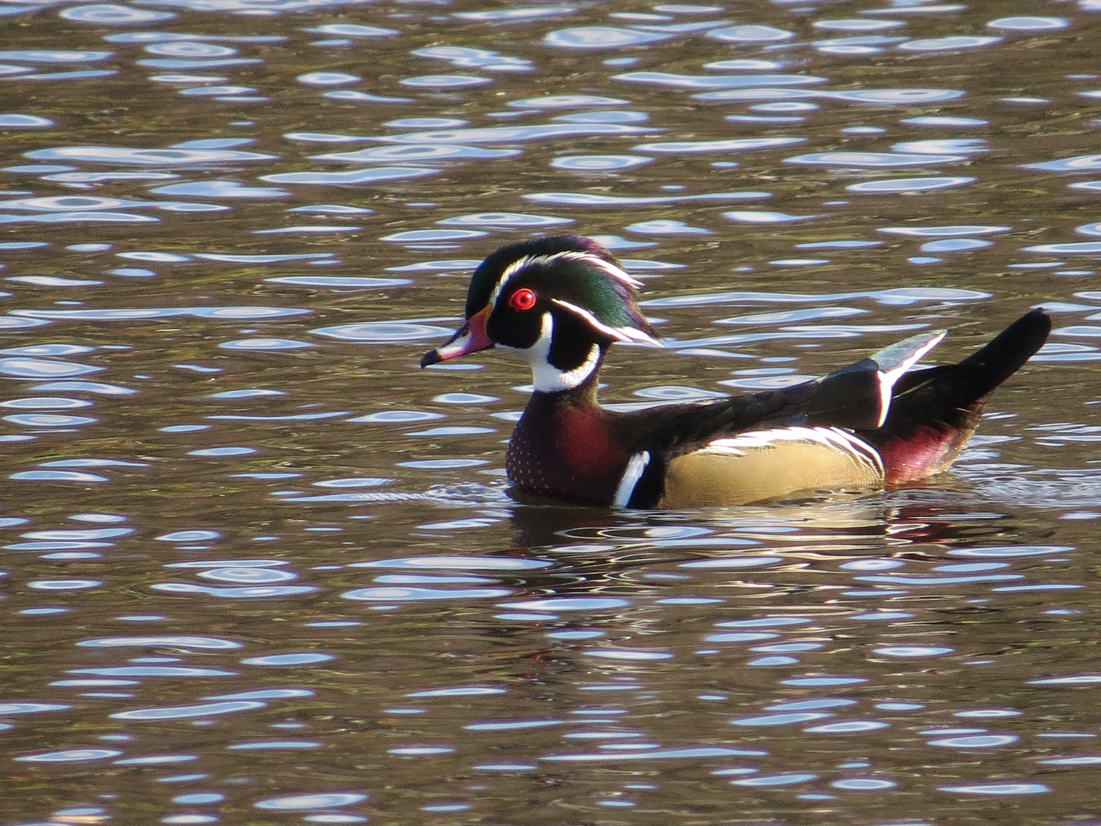 The Valley Water was the sole preserve of a Pied-billed Grebe recently, until this male Wood Duck came in for a landing. He paddled back and forth a few times as if the pond was a fashion runway and then flew off.