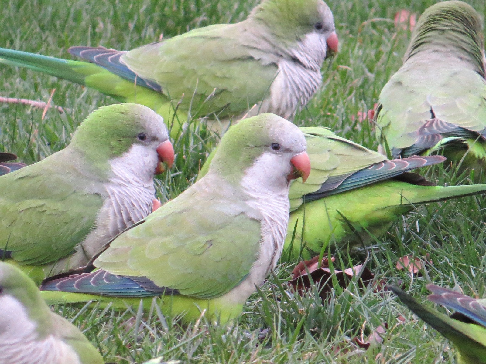 A herd of Monk Parakeets eating grass. I did not know they do this. Myiopsitta monachus generally go for fruit and nuts, but of course this time of year the former is in short supply. But boy, give them a backyard Brooklyn apple tree in the fall and they will be there.