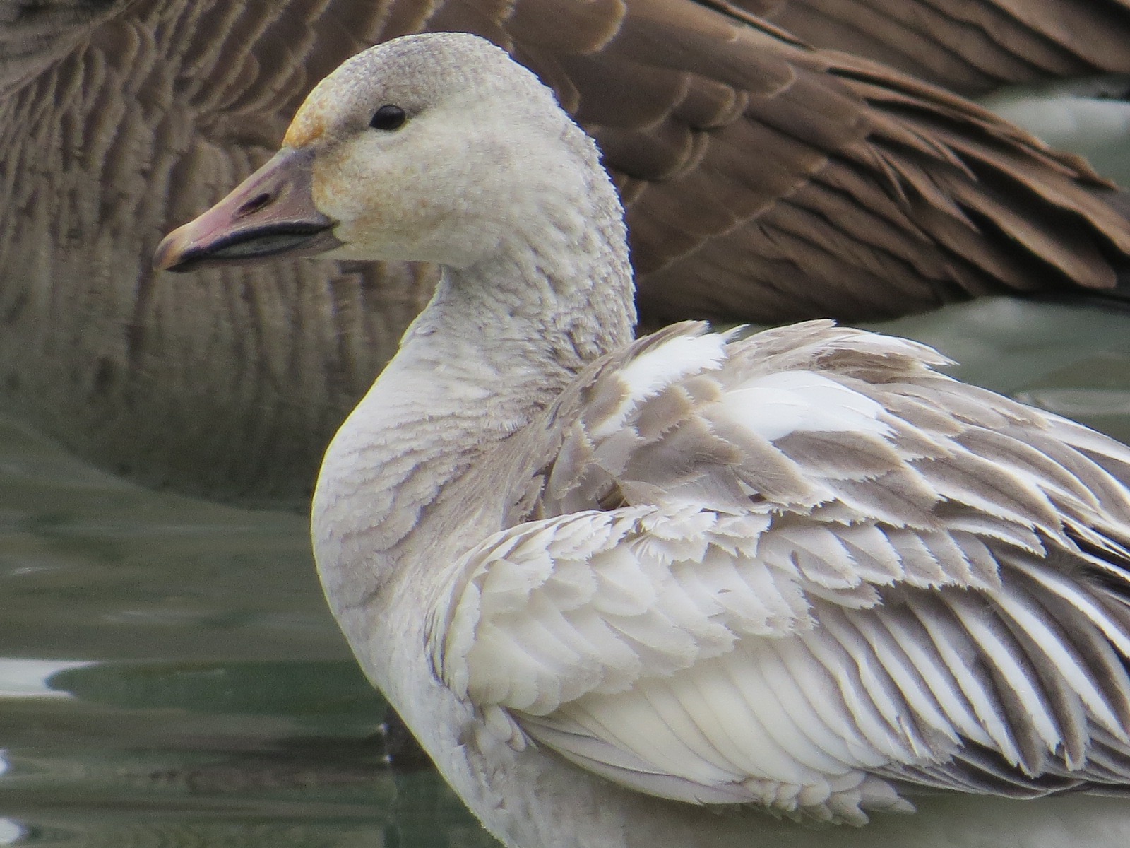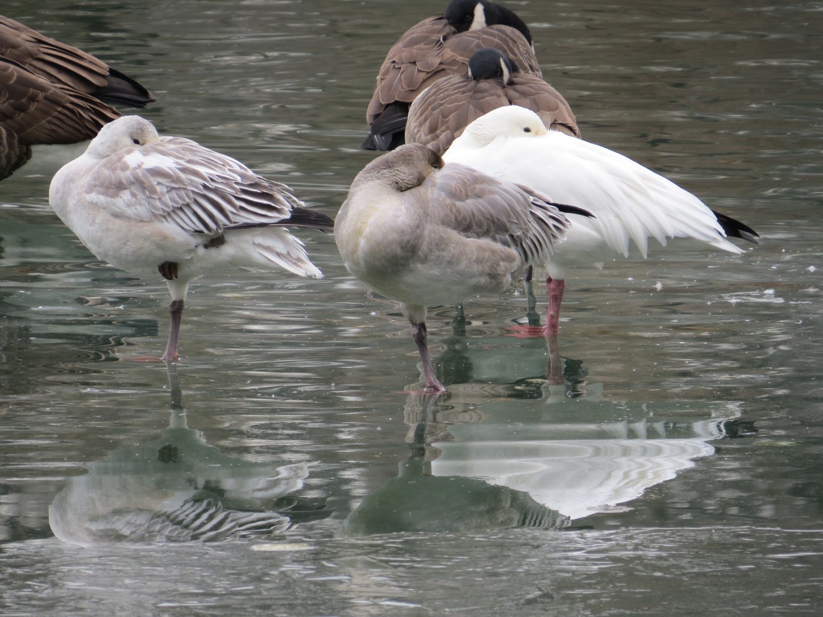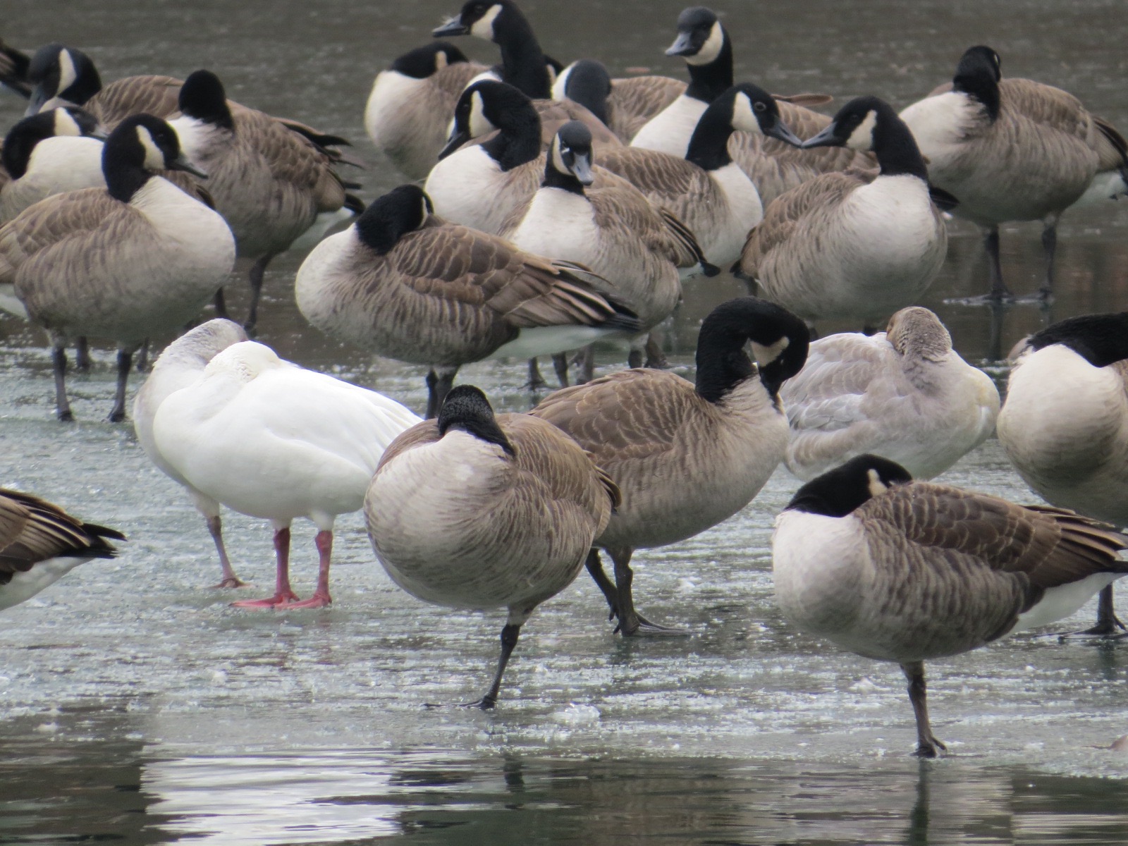 Amidst perhaps 200 Canada Geese (Branta canadensis) on the Upper Pool, a trio of Snow Geese (Chen caerulescens).