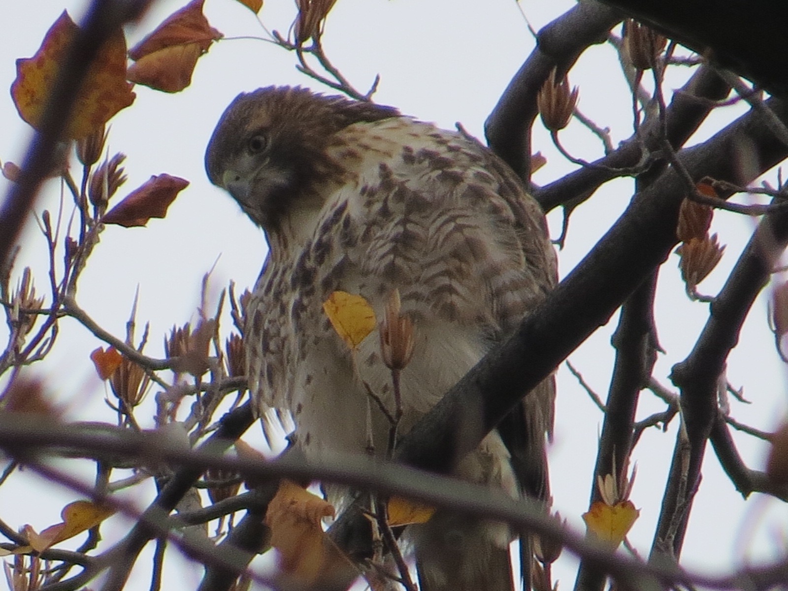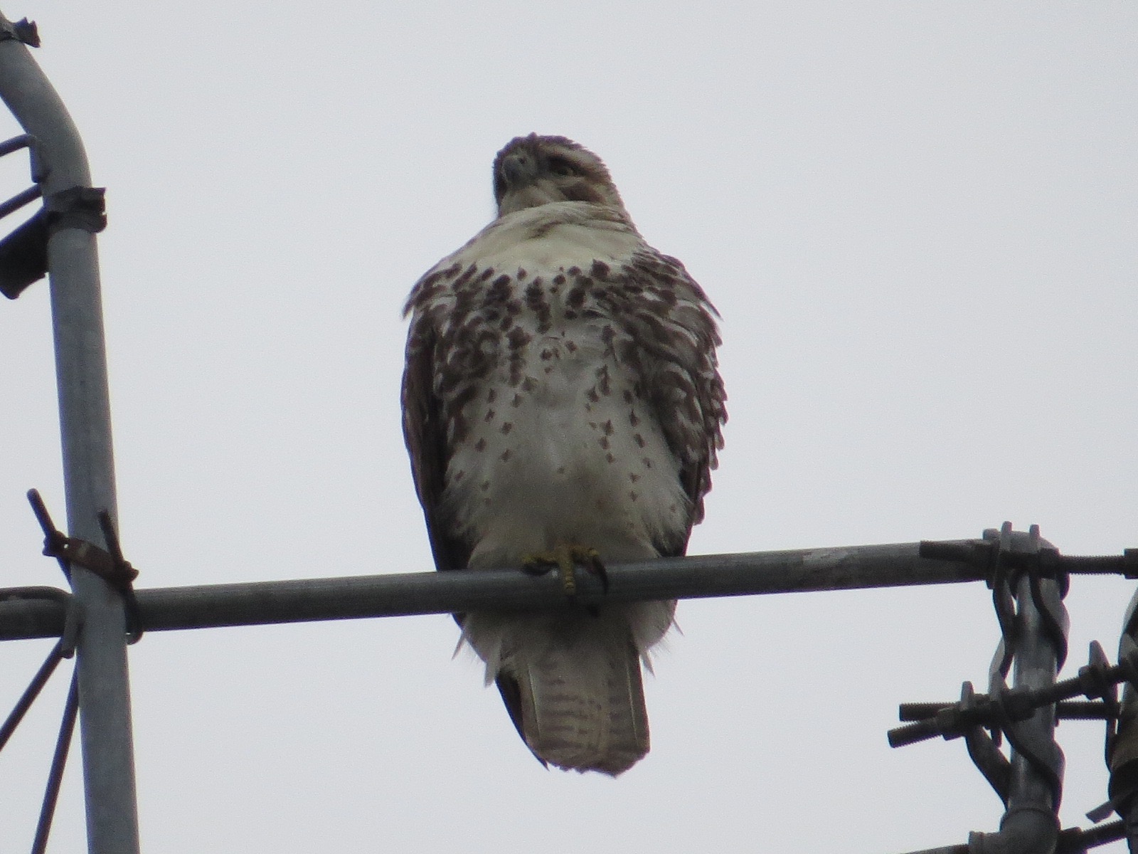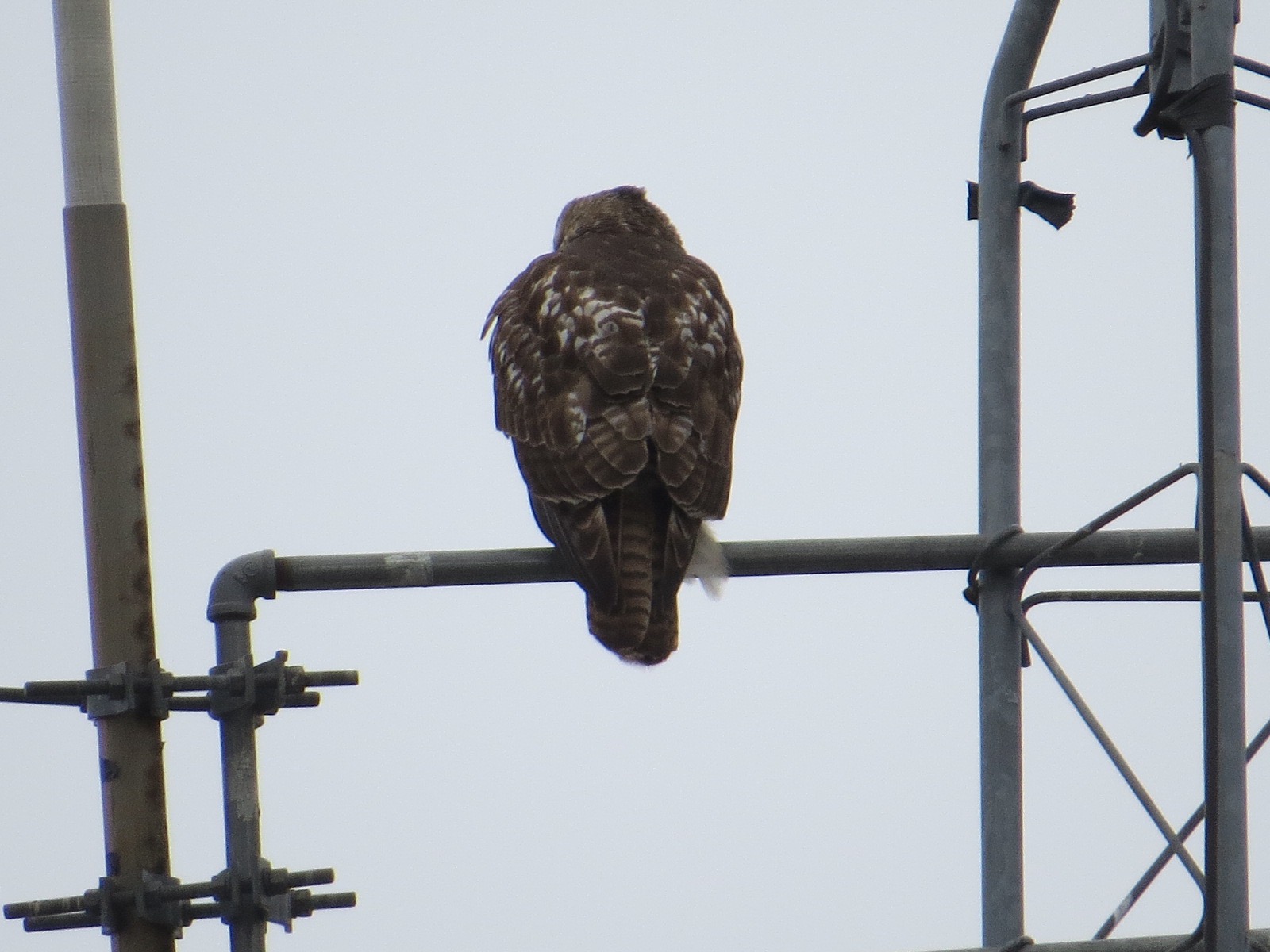 Another day, another sighting. Big shoulders, relatively short, squared-off tail. The mottled white patches on the back, sometimes a little more clearly in a V pattern, are another good sign you’ve got the most common soaring hawk in the country on your local antenna.