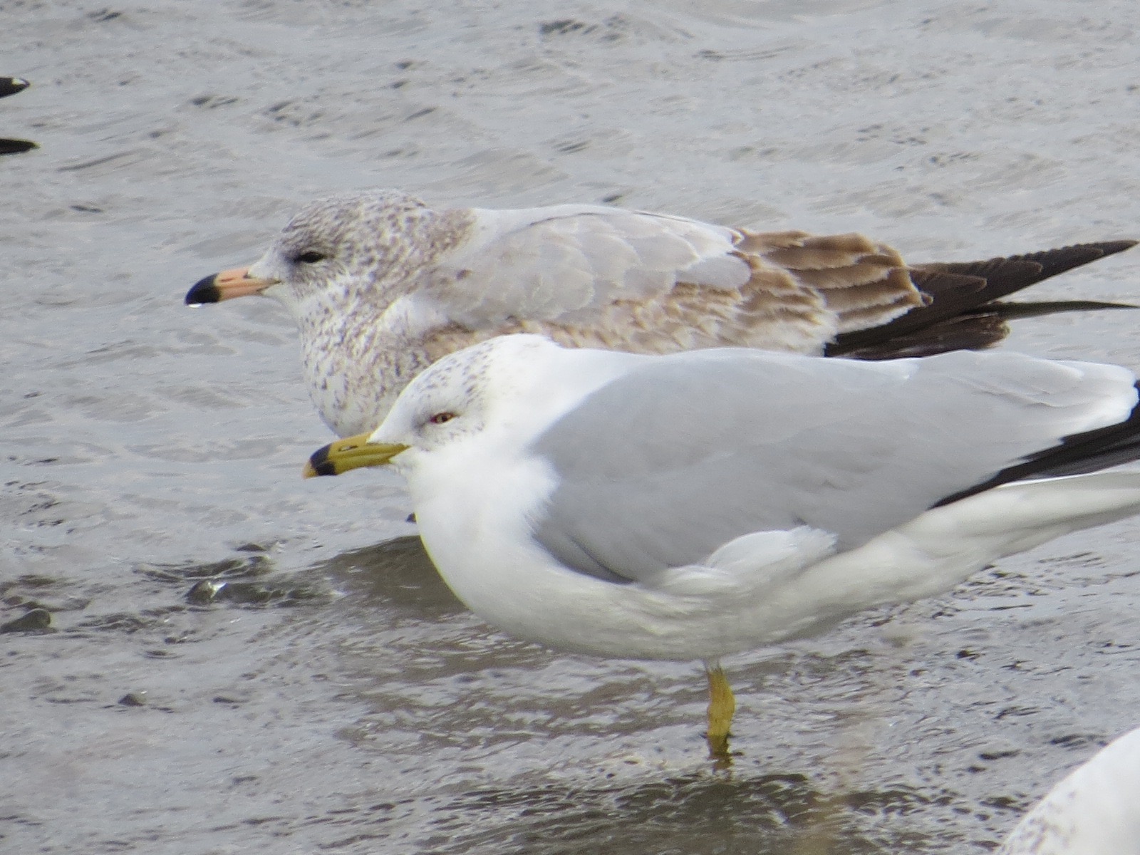 Have you ever noticed how gulls, like these Ring-billed (Larus delawarensis) hunkered down at Bush Terminal, always face the wind? The better to take off into, of course, the better to fly. The specimen to the rear is a first winter bird, the one in front an adult.