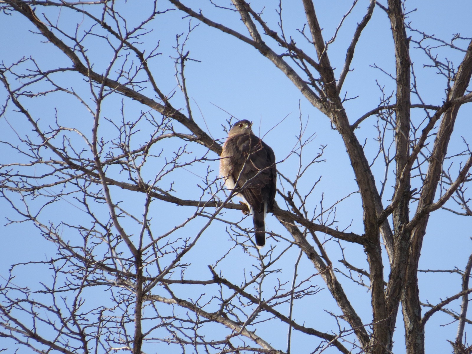 The next to last big bird of the day was this Cooper’s (Accipiter cooperii), making for five species of raptors. It was, you will not be surprised to learn, near the bird feeders at the Nature Center. There, a Carolina Wren (the ones around my parents’ house never came to the feeders) was joined by the usual winter crowd of Juncos, Cardinals, Songs, and Downies.