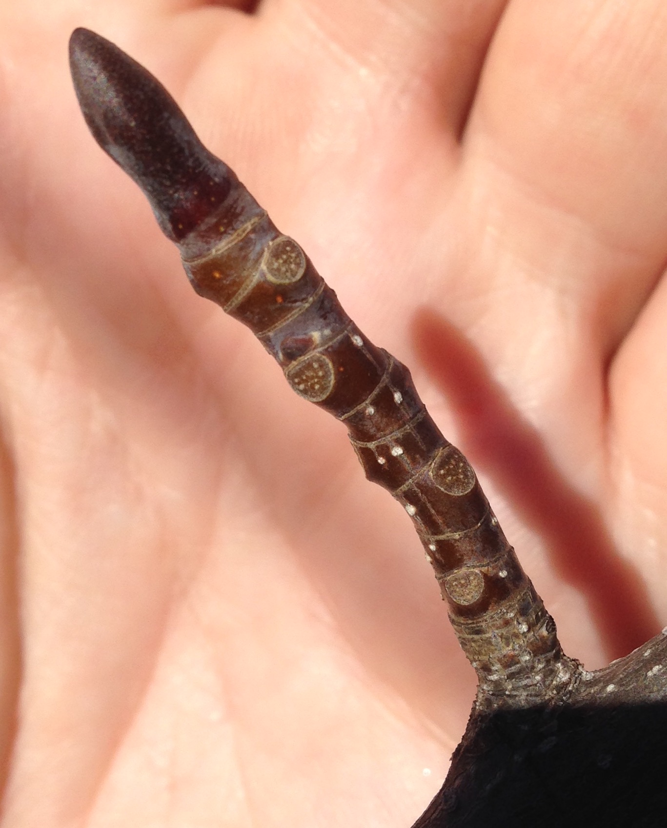 This is our old friend Liriodendron tulipifera. Look at those leaf scars! The bundle scars, too, are nice and obvious. In the Native Flora in Winter course I just took at NYBG, some species’ bundle scars were damned hard to see, even under magnification (magnification is a necessity in this endeavor).