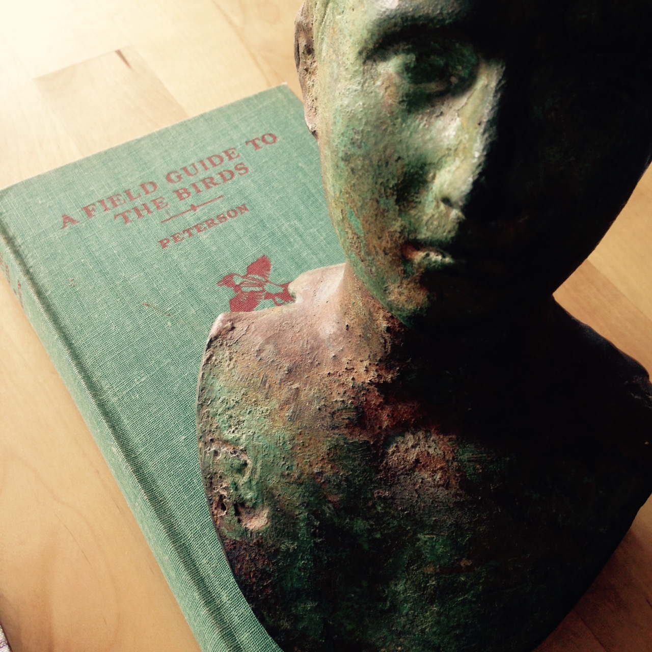 By now, I have copies of both Sibley and Peterson. One of my two Peterson’s is this lichen-green clothbound 1956 version of the 2nd revised & enlarged edition. (The bust, which may be a 19th century European Tour fake, is just parked on it for fun.) An unknown Harry gave this book to the equally unknown Helen for a birthday present in 1958.