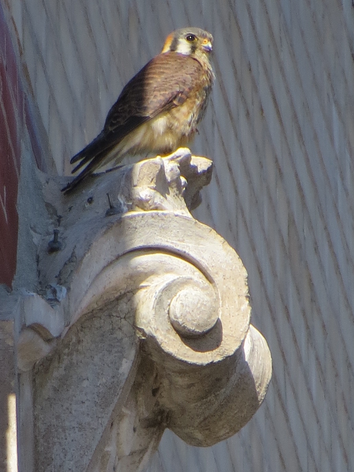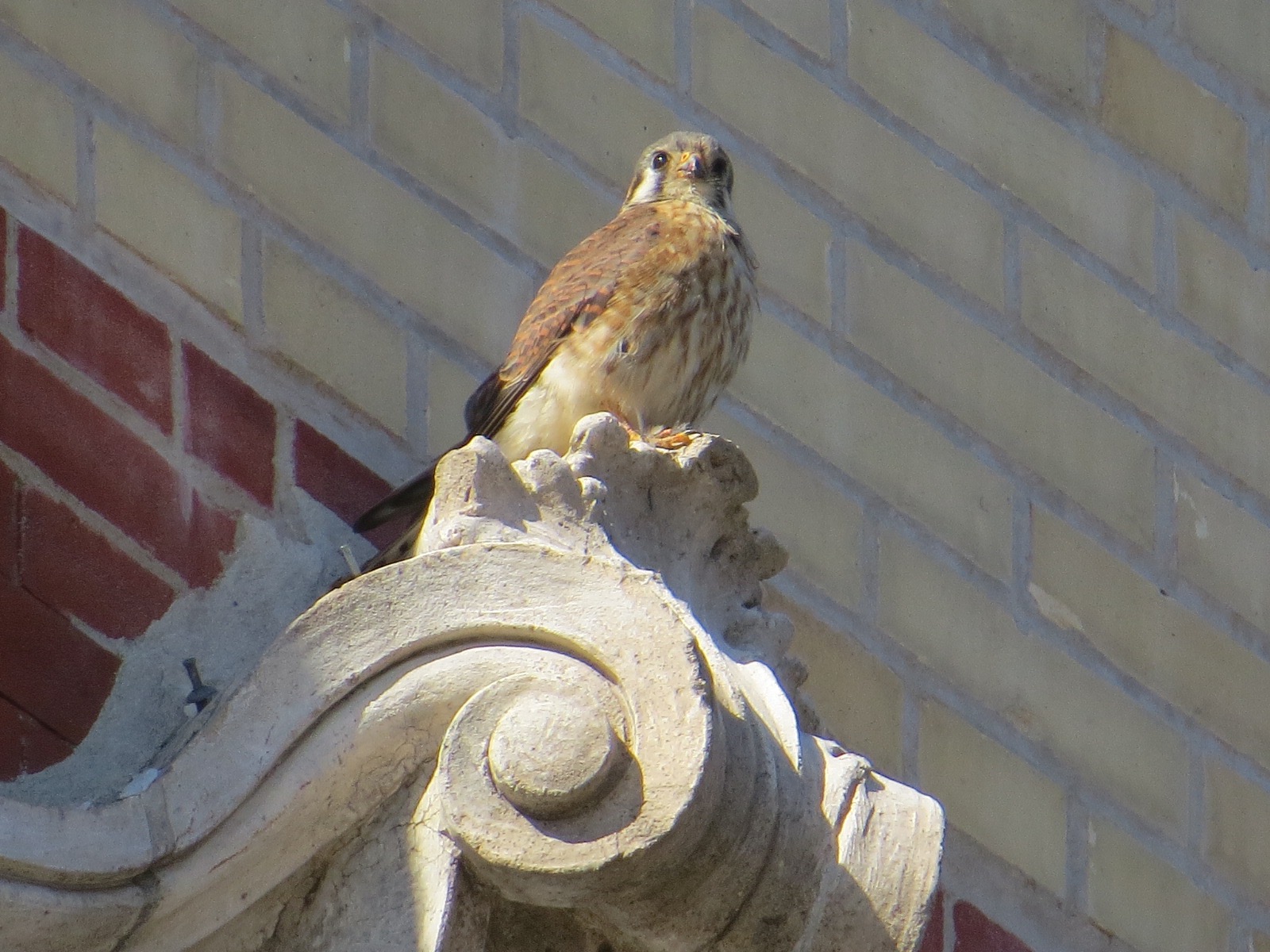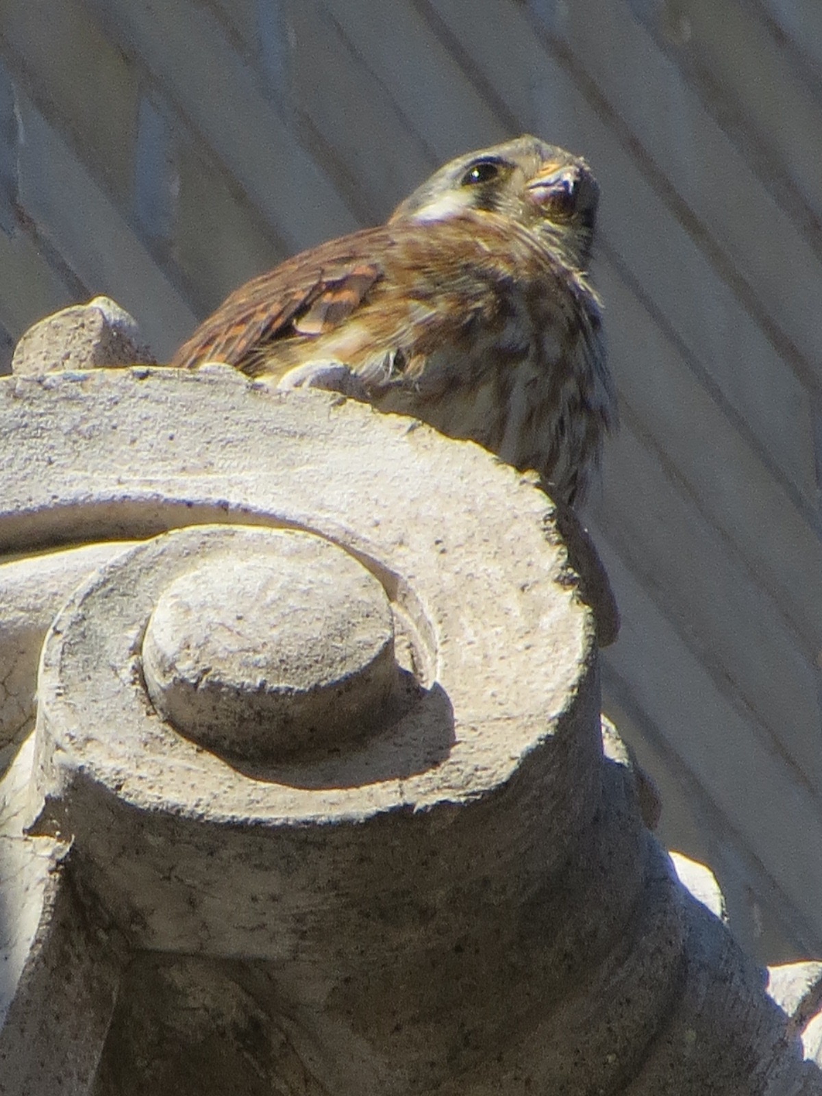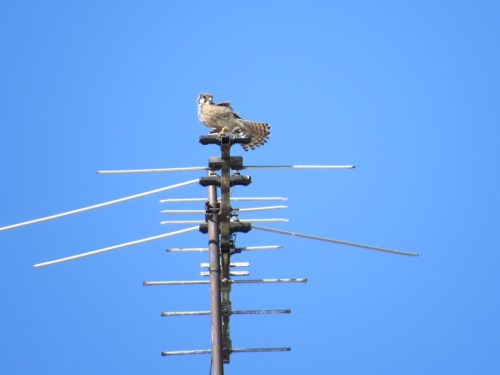 I’ve seen these little falcons on that same antenna before. Such relic roof-toppers are a good place to look for Kestrels here in Brooklyn. Nineteen century cornices to nest in and twentieth century antennas to perch on. (Ruins of ancient civilization.)