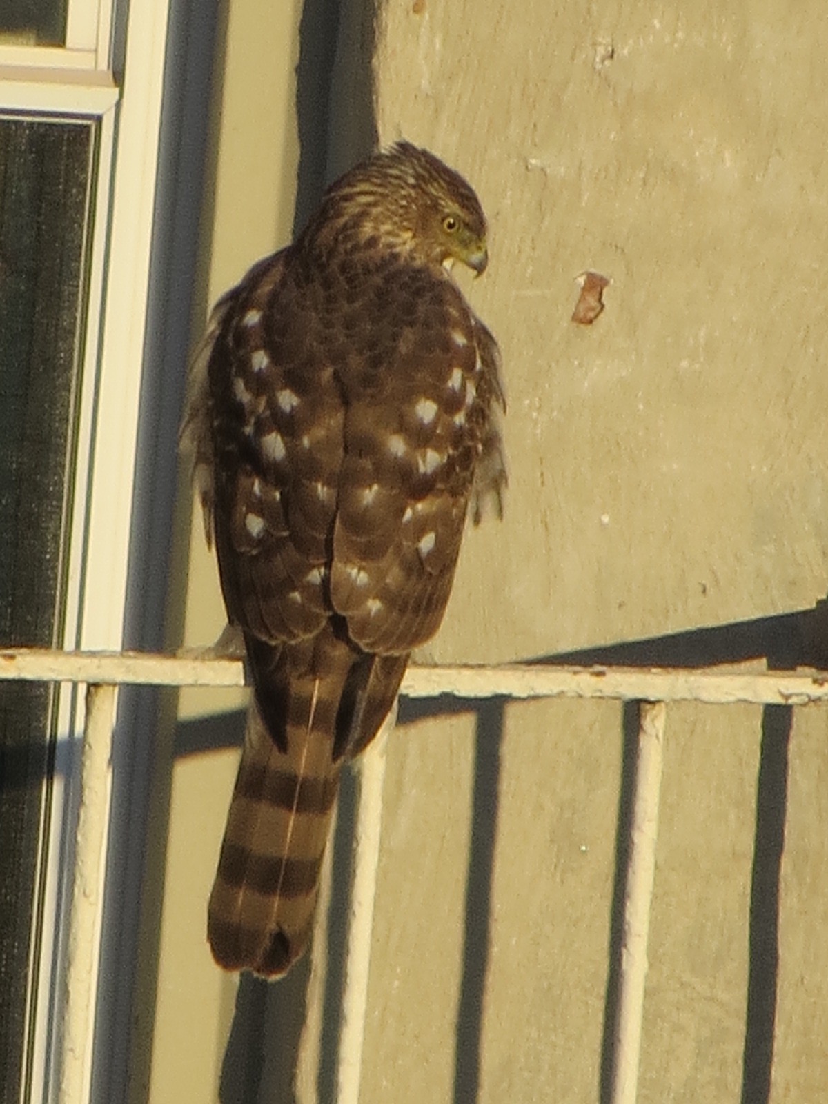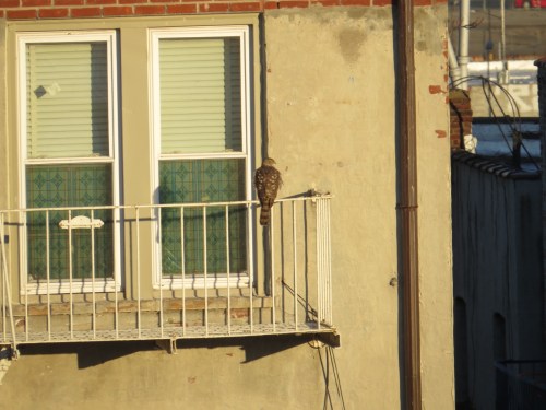 There was a zoom here and a zoom there and a Cooper’s Hawk on patrol took a fairly longish break, for a Cooper’s Hawk, on a fire escape, to watch the local Starlings and Rock Doves and Sparrows recover from their fright.