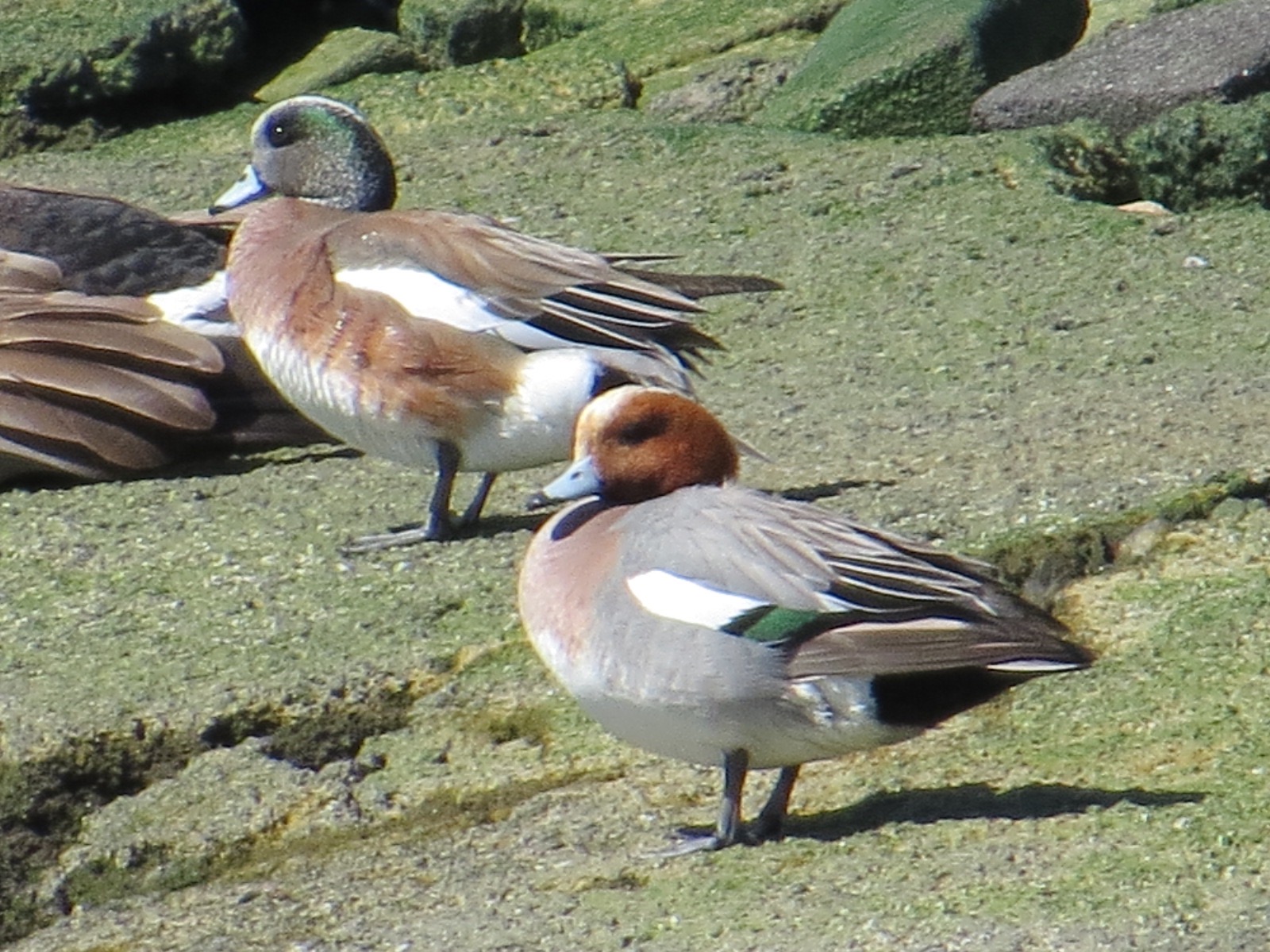 American Wigeon (Anas americana) and Eurasian Wideon (Anas penelope) drakes lined up for comparison’s sake. If only they’d been a little closer! Eurasian, as name suggest, is out of range; but we get a few in local waters most winters.