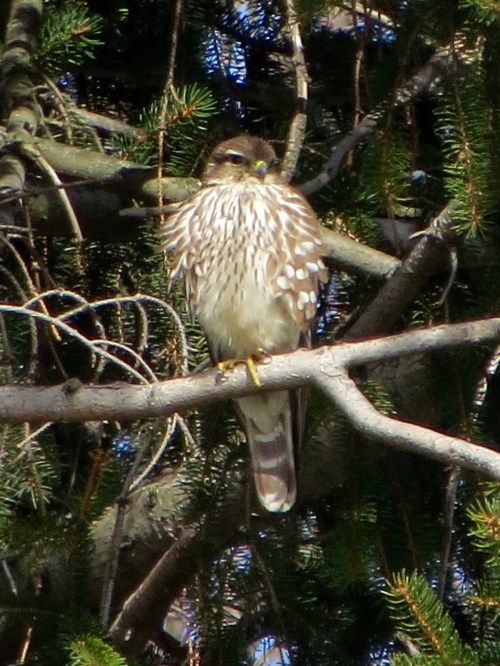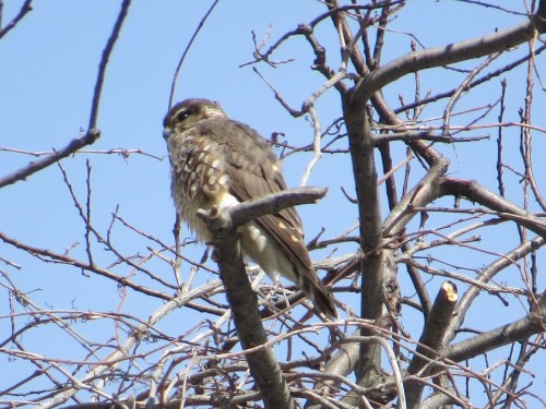 In Green-Wood. This falcon, seen here on two different perches, was one of two by the Crescent Water at the same time. The other flew into a nearby tree — but the photography possibilities were not worth posting home about. The second bird took off, followed by the first. I wasn’t sure if this territorial or courtship behavior.