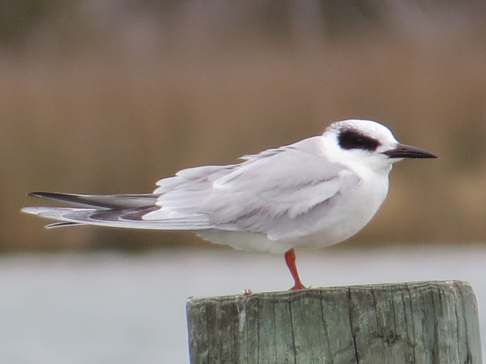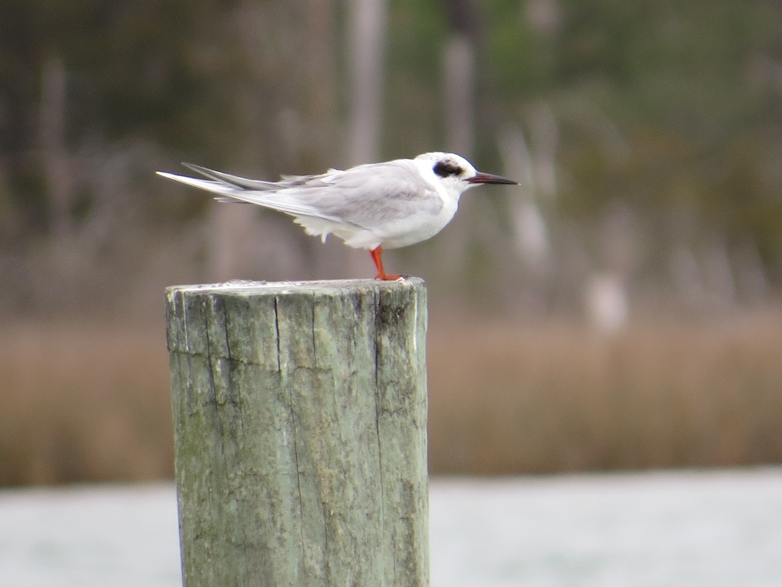 This is a Forster’s (Sterna forsteri) in (mostly) non-breeding plumage. A good field mark is that dark mask and pale nape. Also most helpful: not moving for a good long view.