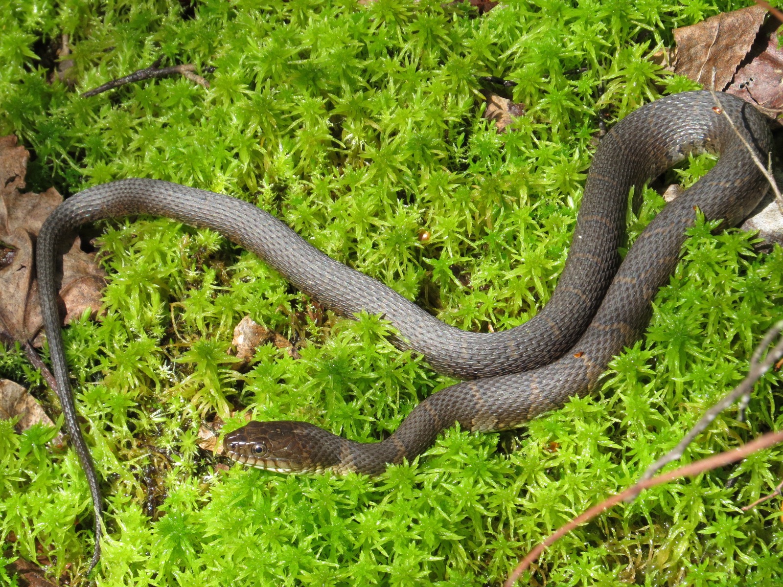 Northern Water Snake (Nerodia sipedon). Saw a half dozen basking off of the boardwalk. This common snake, second only to the Garter in abundance regionally, is, like that species, somewhat varied in form. You can see stripes on this youngish one, but most Great Swamp specimens look very dark and unmarked (as they dry in the sun, the scales tend to look more uniform). This is one of the snake species that give birth to live young, one to three dozen itty-bitty snakes.