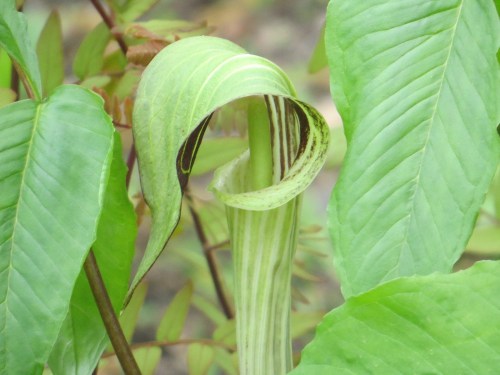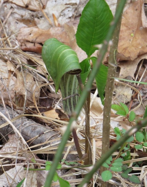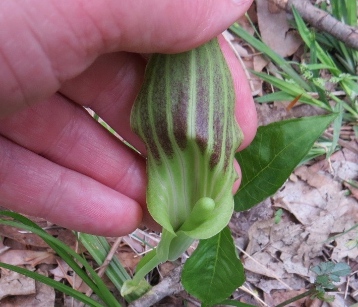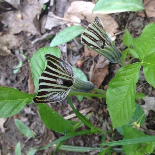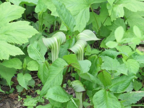 Someone hath browsed off the overhanging spathes and tips of the spadicies of these Jack-in-the-pulpits (Arisaema triphyllum). This gives us a good view of the pin-striped goodness within these curious flowers.