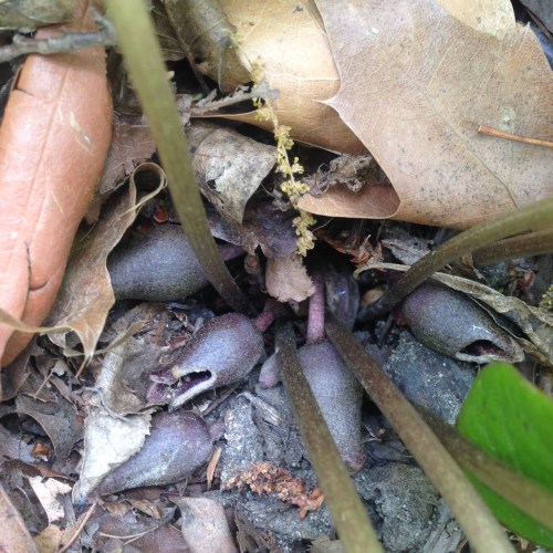 As in wild ginger (Asarum canadense), a related plant, the action is at ground-level. The little brown jugs (LBJs?) are flowers that start out green and age brown. While these particular specimens were found in the native plant section of the NYBG, they are more specifically native to the SE, getting as north as Virginia and as west as Kentucky. Ants evidently disperse the seeds.