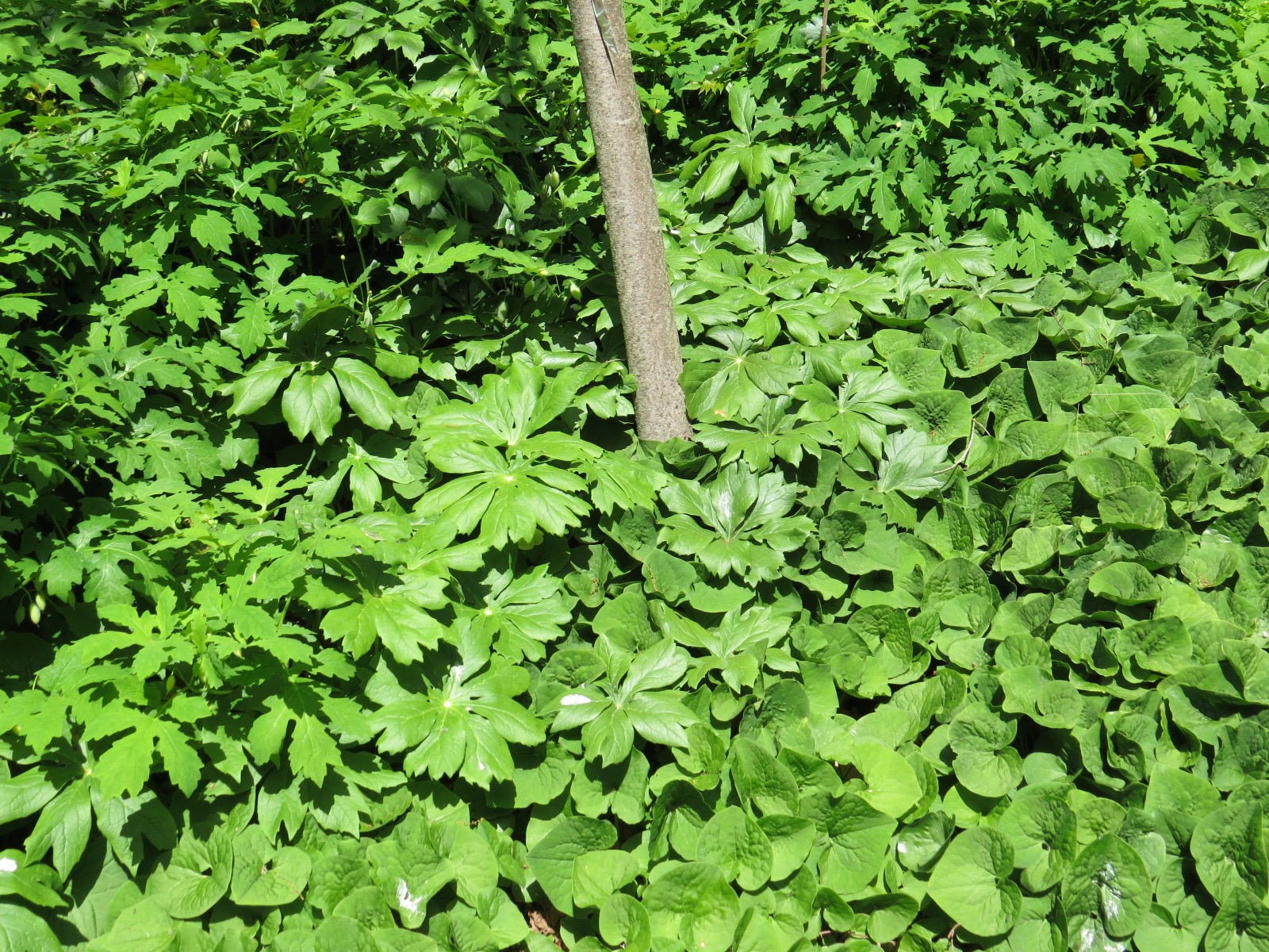 Pier 1 at Brooklyn Bridge Park has a rather spectacular understory layer in its seventh year. From the top left: Celandine-poppy (Stylophorum diphyllum), mayapple (Podophyllum peltatum), and wild ginger (Asarum canadense).